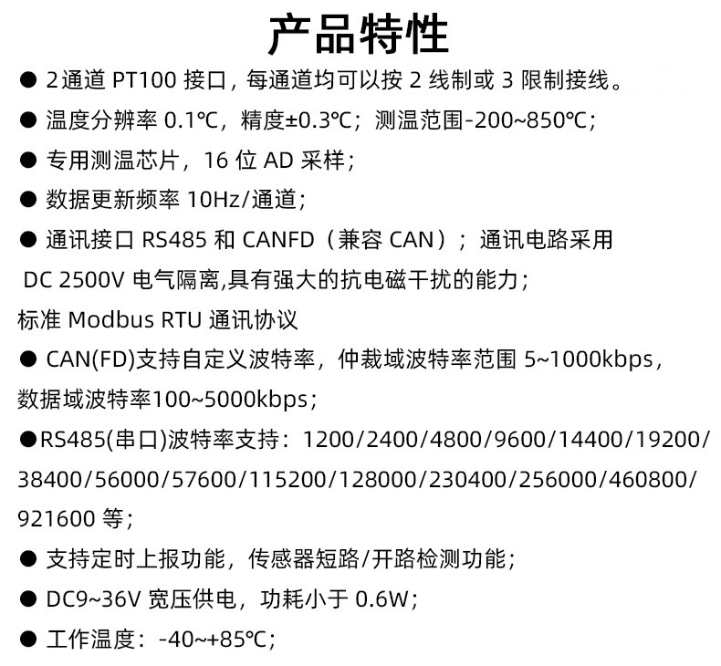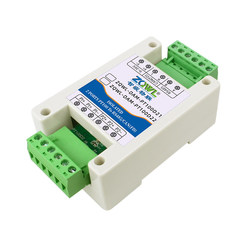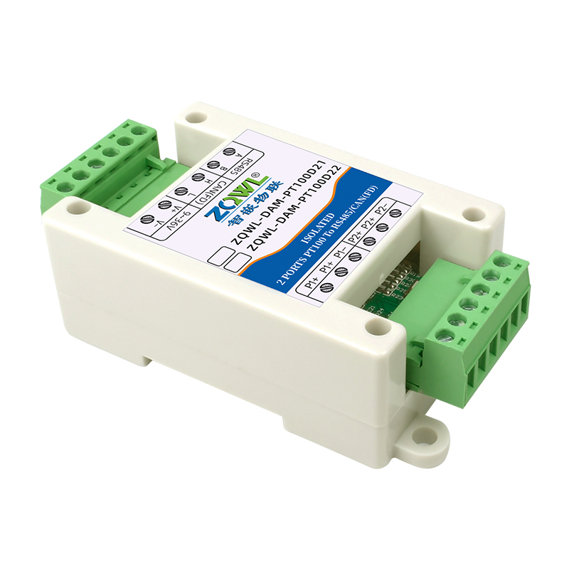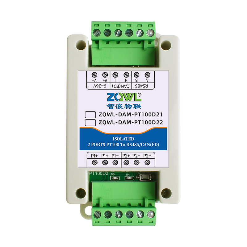智嵌物联 ZQWL 开发的一系列高精度高稳定性的 PT100 温度检测模块,支持 3 线制和2 线制,温度分辨率 0.1℃;具有 RS485 和 CAN(FD)通讯接口,通讯均采用电气隔离设计,适用于电磁环境恶劣的场合。