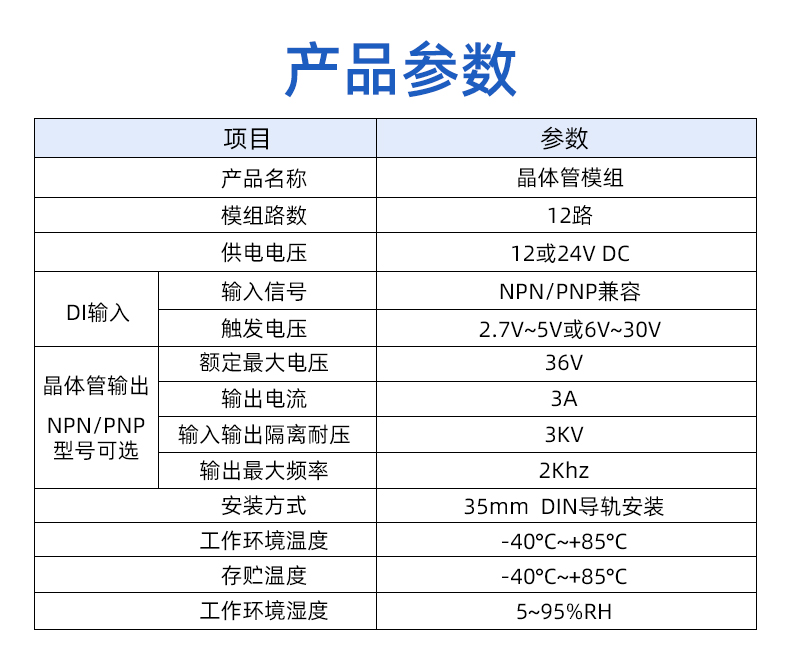 12路光耦隔离型晶体管模组,是实现开关量采集(输入)和晶体管 NPN/PNP 输出的 PLC 放大板,广泛运用于工业控制系统中输入设备与输出设备之间的隔离,电流放大,提高带载能力。产品采用光耦隔离放大输入信号,3KV 的隔离电压有效保护电路。兼容 NPN/PNP 输入,且 NPN/PNP 输出可选,丰富的 LED 状态指示运行灯,外壳采用高品质阻燃材料,耐高温、腐蚀。继电器输出负载电流 10A,晶体管采用高品质场效应管 P 沟道和 N 沟道可选。