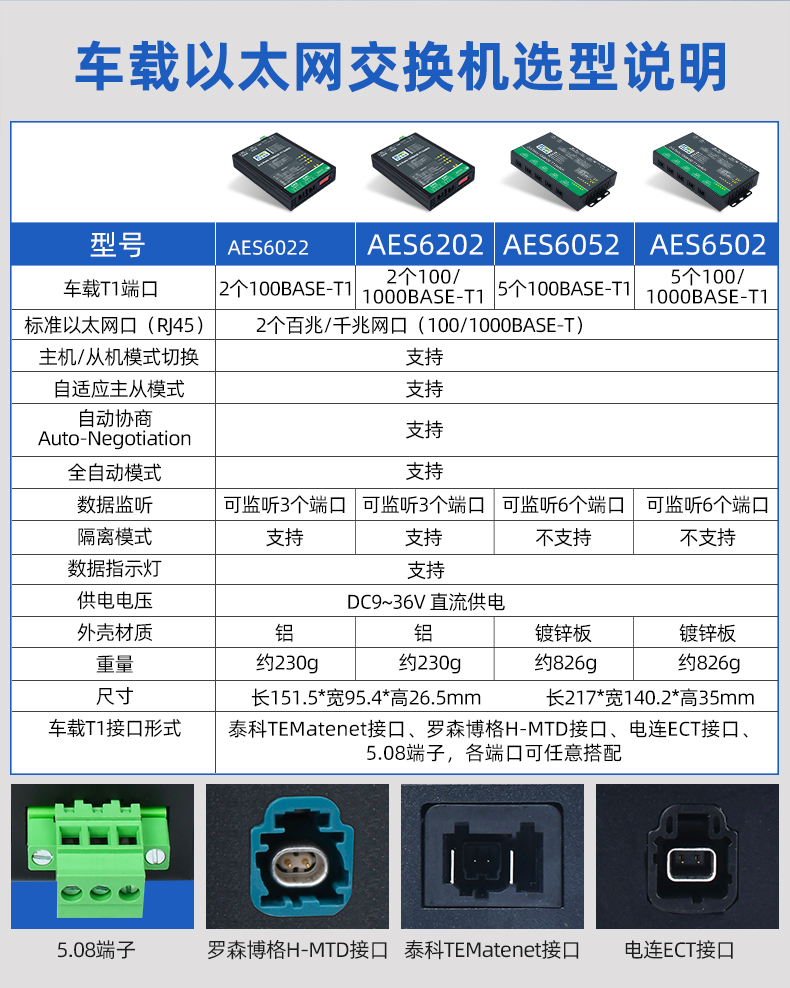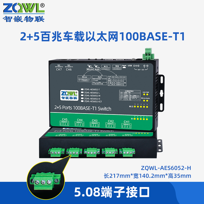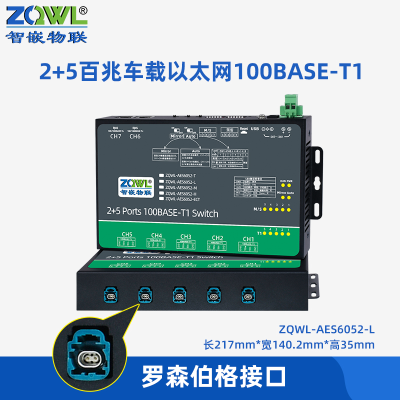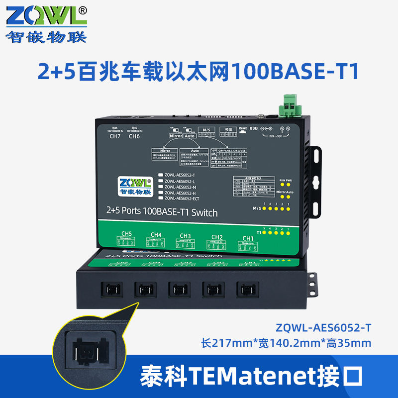 ZQWL-AES6052-T 百兆千兆车载以太网交换机智嵌物联自主研发生产的一款 2+5 端口百兆车载以太网(100BASE-T1)交换机。具有 2 个 RJ45 千兆网口(100BASE-TX/1000BASE-TX)、5 个百兆车载以太网接口(100BASE-T1);设备支持镜像监控模式、端口隔离模式、手动设置模式、全自动模式等;具有丰富的指示灯,设备工作状态一目了然。该设备是最通用的车载以太网工具,可作为动态监听工具、媒介转换器来使用。