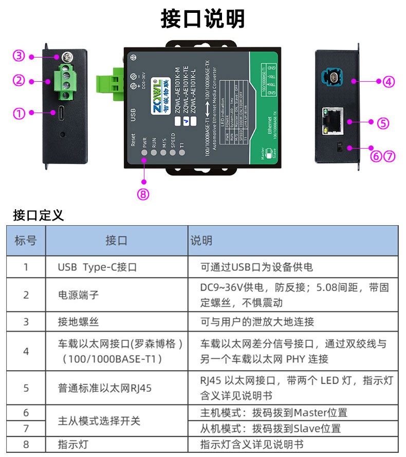 ZQWL-AE101K 是一款千兆车载以太网(100/1000BASE-T1)到 RJ45 普通以太网(100/1000BASE-TX)的转接器。该设备实现了普通以太网和千兆车载以太网的物理层点对点的双向透明转换,不存储或修改任何以太网数据包。