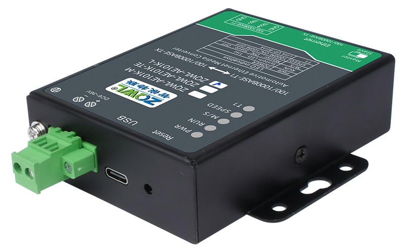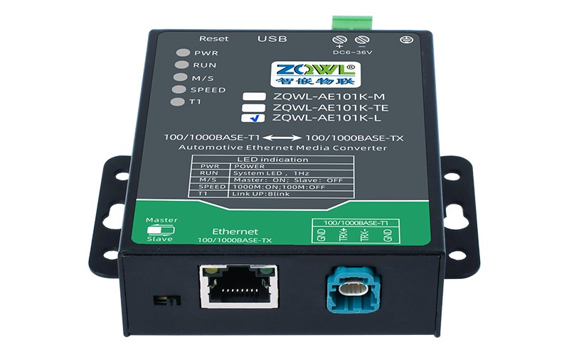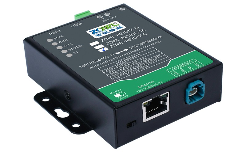 ZQWL-AE101K 是一款千兆车载以太网(100/1000BASE-T1)到 RJ45 普通以太网(100/1000BASE-TX)的转接器。该设备实现了普通以太网和千兆车载以太网的物理层点对点的双向透明转换,不存储或修改任何以太网数据包。