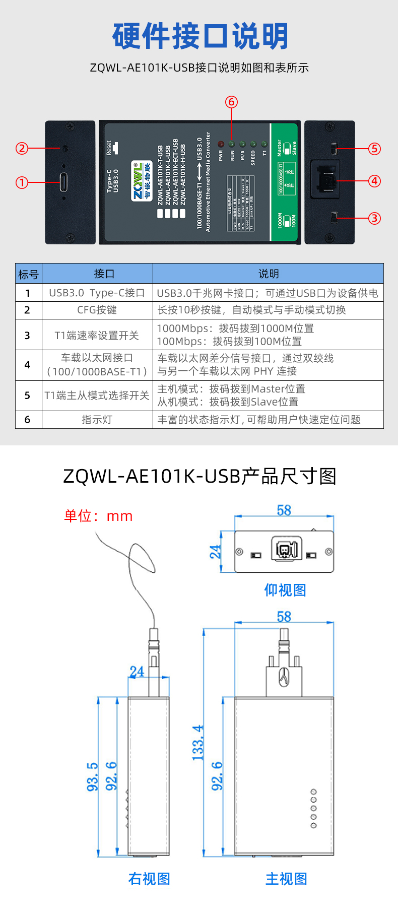 ZQWL-AE101K-USB接口说明如图和表所示