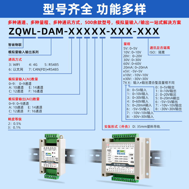 ZQWL-DAM-5023D 双极性模拟量输出系列是智嵌物联推出的高精度模拟量输出模块,采集精度 0.1%。输出量程可选:-5~5V;-10~10V,输出精度 0.1%。模块带有 1 路隔离的 RS485 或 CAN 通讯接口,可以通过该接口上传数据。该系列支持标准的有 Modbus RTU 协议,具有 2 种数据输出格式:16 位无符号整型值输出和 32 位标准 IEEE-754 浮点数输出,使用灵活方便。