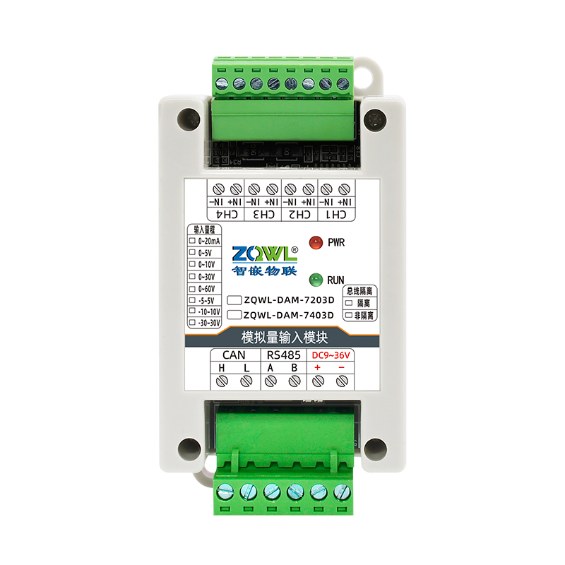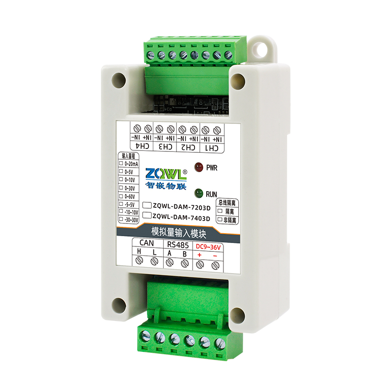 ZQWL-DAM-7203D串口+CAN版- 双极性模拟量输入系列是智嵌物联推出的高精度模拟量输入模块,输入量程可选:0~5V;0~10V;0~30V;0~60V;0~20mA,采集精度 0.1%。模块带有 1 路隔离的 RS485 或 CAN 通讯接口,可以通过该接口上传数据,该系列支持标准的有 Modbus RTU 协议。