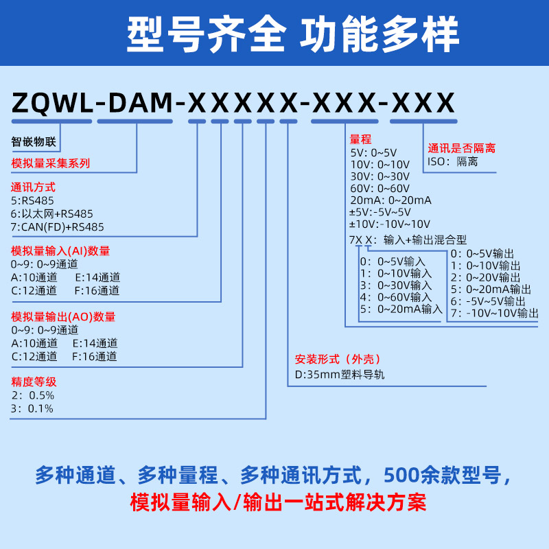 ZQWL-DAM模拟量采集系列是智嵌物联推出的高精度模拟量采集模块,量程可选:0~5V;0~10V;0~20V;0~20mA,采集精度0.1%。采集板带有1路隔离的RS485或CAN通讯接口,可以通过该接口上传数据。该系列支持标准的有Modbus RTU协议,具有2种数据输出格式:16位无符号整型值输出和32位标准IEEE-754浮点数输出,使用灵活方便。