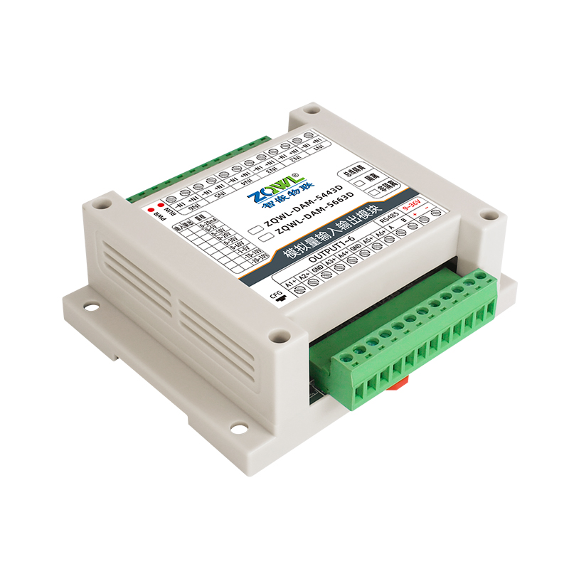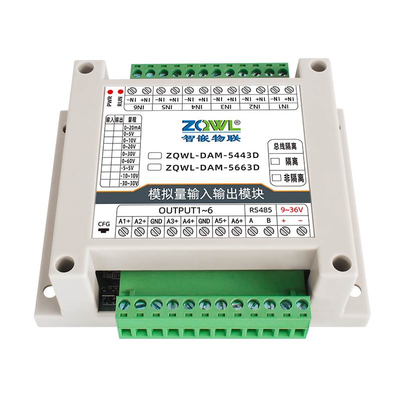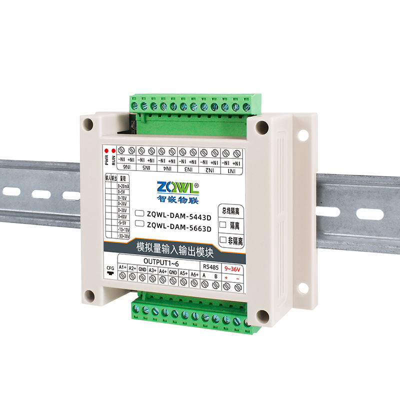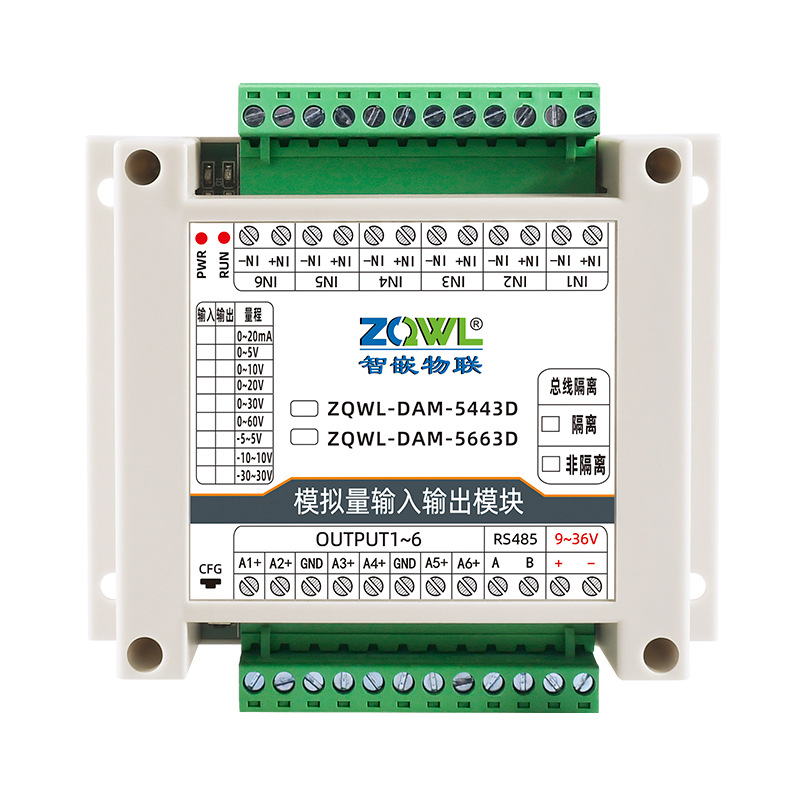 ZQWL-DAM-5663D 双极性模拟量输入输出系列是智嵌物联推出的高精度模拟量输入和输出模块,输入量程可选:±5V ; ±10V ; ±30V,采集精度 0.1%。输出量程可选:±5V ; ±10V 输出精度 0.1%。可以通过该接口上传数据。该系列支持标准的有 Modbus RTU 协议,具有 2 种数据输出格式:16 位无符号整型值输出和 32 位标准 IEEE-754 浮点数输出,使用灵活方便。