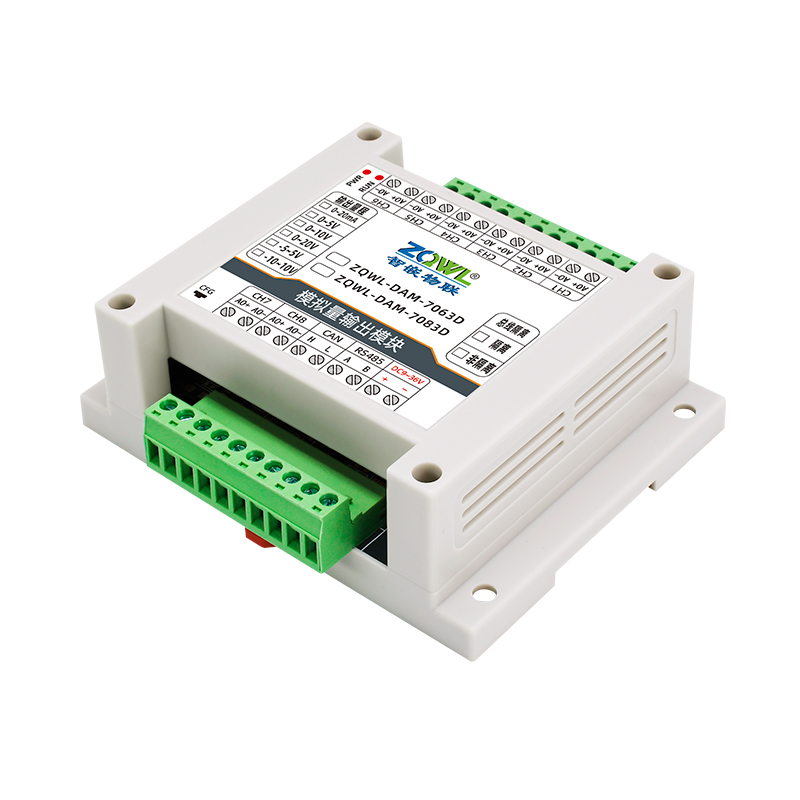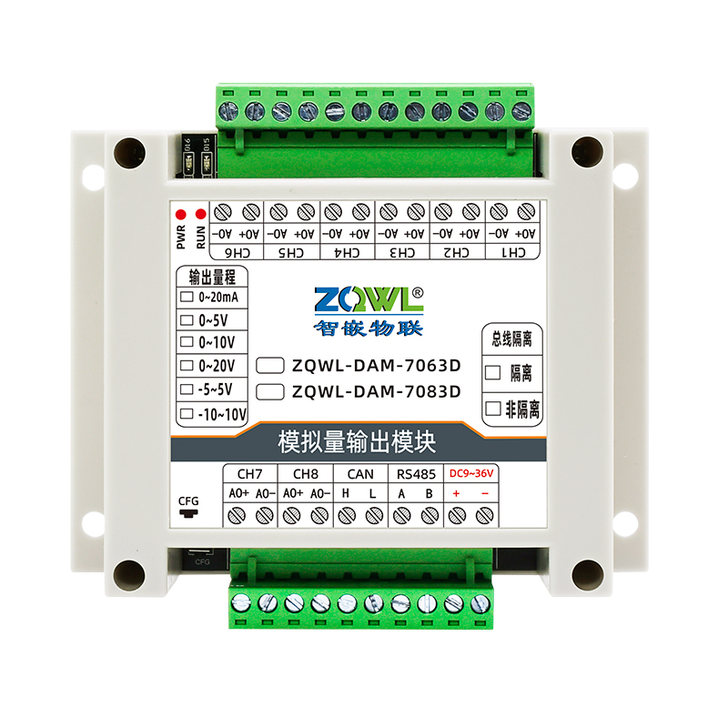ZQWL-DAM-7063D串口+CAN 双极性模拟量输出系列是智嵌物联推出的高精度模拟量输出模块,输出量程可选:-5~5V;-10~10V,输出精度 0.1%。模块带有 1 路隔离的 RS485 或 CAN 通讯接口,可以通过该接口上传数据。该系列支持标准的有 Modbus RTU 协议,具有 2 种数据输出格式:16 位无符号整型值输出和 32 位标准 IEEE-754 浮点数输出,使用灵活方便。