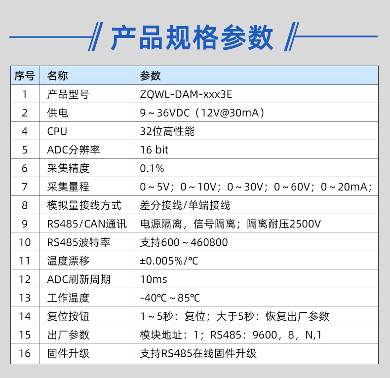 ZQWL-DAM-5603E 串口版 单极性模拟量输入系列是智嵌物联推出的高精度模拟量输入模块,输入量程可选:0~5V;0~10V;0~30V;0~60V;0~20mA,采集精度 0.1%。模块带有 1 路隔离的 RS485 或 CAN 通讯接口,可以通过该接口上传数据。该系列支持标准的有 Modbus RTU 协议,具有 2 种数据输出格式:16 位无符号整型值输出和 32 位标准 IEEE-754 浮点数输出,使用灵活方便。