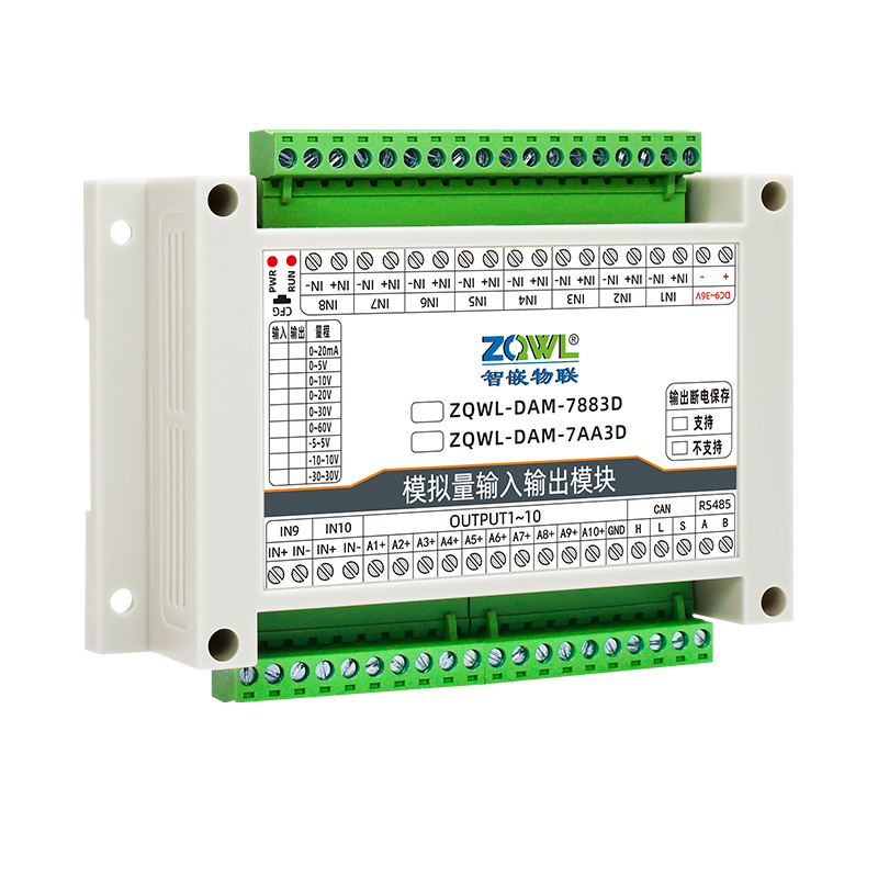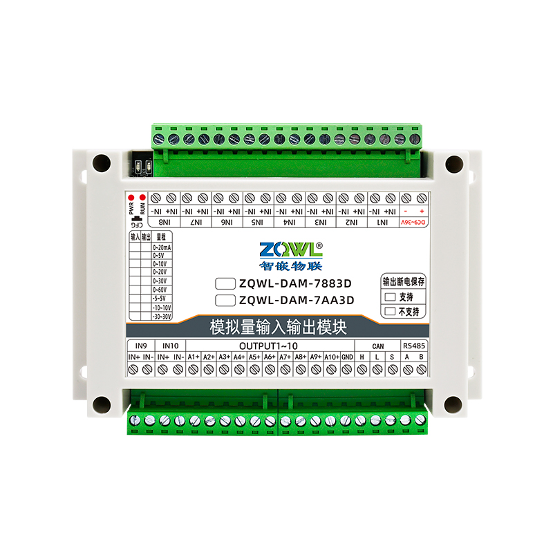 ZQWL-DAM-7883D 单极性模拟量输入输出系列是智嵌物联推出的高精度模拟量输入和输出模块,输入量程可选:0~5V;0~10V;0~30V;0~60V;0~20mA,采集精度 0.1%。输出量程可选: 0~5V;0~10V;0~20V;0~20mA,输出精度 0.1%。模块带有 1 路隔离的 RS485 或 CAN 通讯接口,可以通过该接口上传数据。该系列支持标准的有 Modbus RTU 协议,具有 2 种数据输出格式:16 位无符号整型值输出和 32 位标准 IEEE-754 浮点数输出,使用灵活方便。