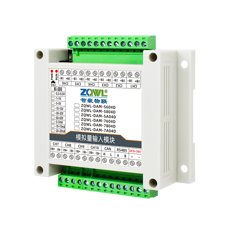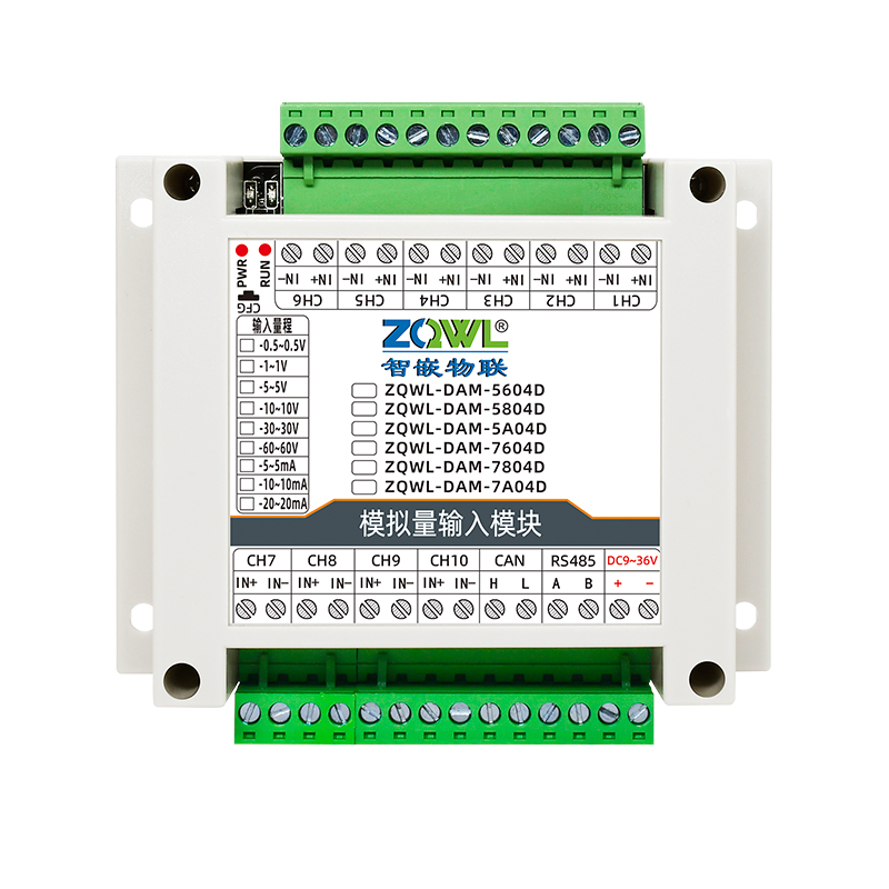 ZQWL-DAM-xx04D 模拟量输入系列是智嵌物联推出的高精度模拟量采集模块,采集量程可选:±0.5V;±1V;±5V;±10V;±30V;±60V;±5mA;±10mA;±20mA,内置1 个或2 个24 bit 的 ADC,采集精度 0.01%(万分之一)