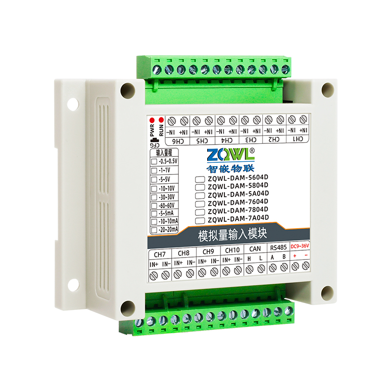 ZQWL-DAM-xx04D 模拟量输入系列是智嵌物联推出的高精度模拟量采集模块,采集量程可选:±0.5V;±1V;±5V;±10V;±30V;±60V;±5mA;±10mA;±20mA,内置1 个或2 个24 bit 的 ADC,采集精度 0.01%(万分之一)。