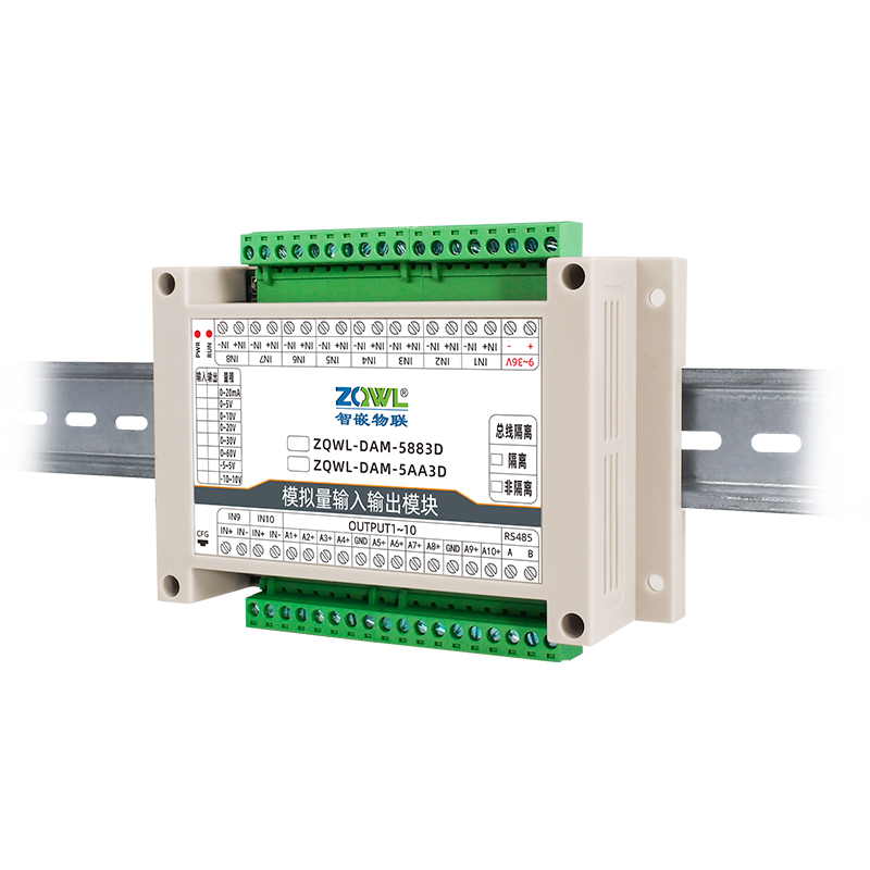 ZQWL-DAM 10路单极性模拟量输入输出系列是智嵌物联推出的高精度模拟量输入和输出模块,输入量程可选:0~5V;0~10V;0~30V;0~60V;0~20mA,采集精度0.1%。输出量程可选: 0~5V;0~10V;0~20V;0~20mA,输出精度 0.1%。模块带有 1 路隔离的RS485 或CAN通讯接口,可以通过该接口上传数据。该系列支持标准的有 Modbus RTU 协议,具有2 种数据输出格式:16 位无符号整型值输出和 32 位标准 IEEE-754 浮点数输出,使用灵活方便。