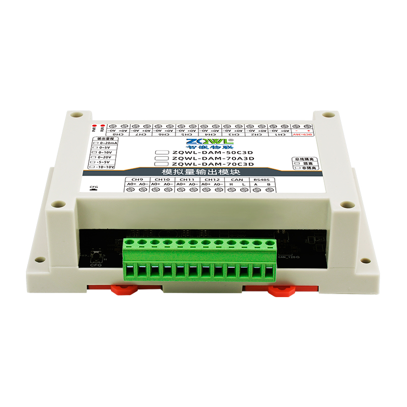 ZQWL-DAM-70C3D 12路 单极性模拟量输出系列是智嵌物联推出的高精度模拟量输出模块,输出量程可选: 0~5V;0~10V;0~20V;0~20mA,输出精度0.1%。模块带有1路隔离的RS485或CAN通讯接口,可以通过该接口上传数据。该系列支持标准的有Modbus RTU协议,具有2种数据输出格式:16位无符号整型值输出和32位标准IEEE-754浮点数输出,使用灵活方便。