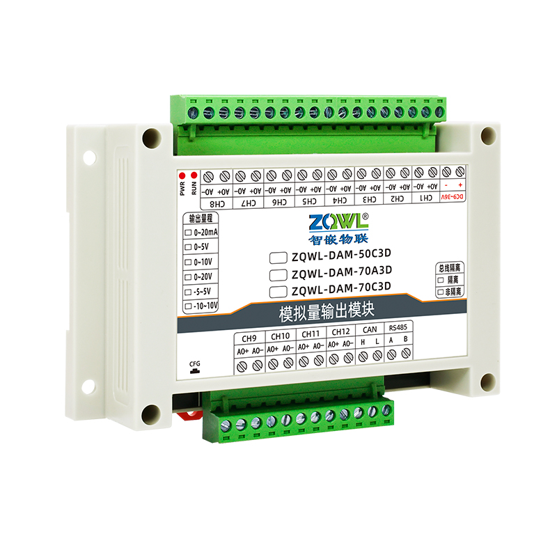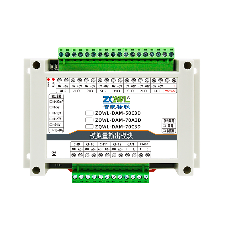 ZQWL-DAM-70C3D串口+CAN 双极性模拟量输出系列是智嵌物联推出的高精度模拟量输出模块,输出量程可选:-5~5V;-10~10V,输出精度 0.1%。模块带有 1 路隔离的 RS485 或 CAN 通讯接口,可以通过该接口上传数据。该系列支持标准的有 Modbus RTU 协议,具有 2 种数据输出格式:16 位无符号整型值输出和 32 位标准 IEEE-754 浮点数输出,使用灵活方便。