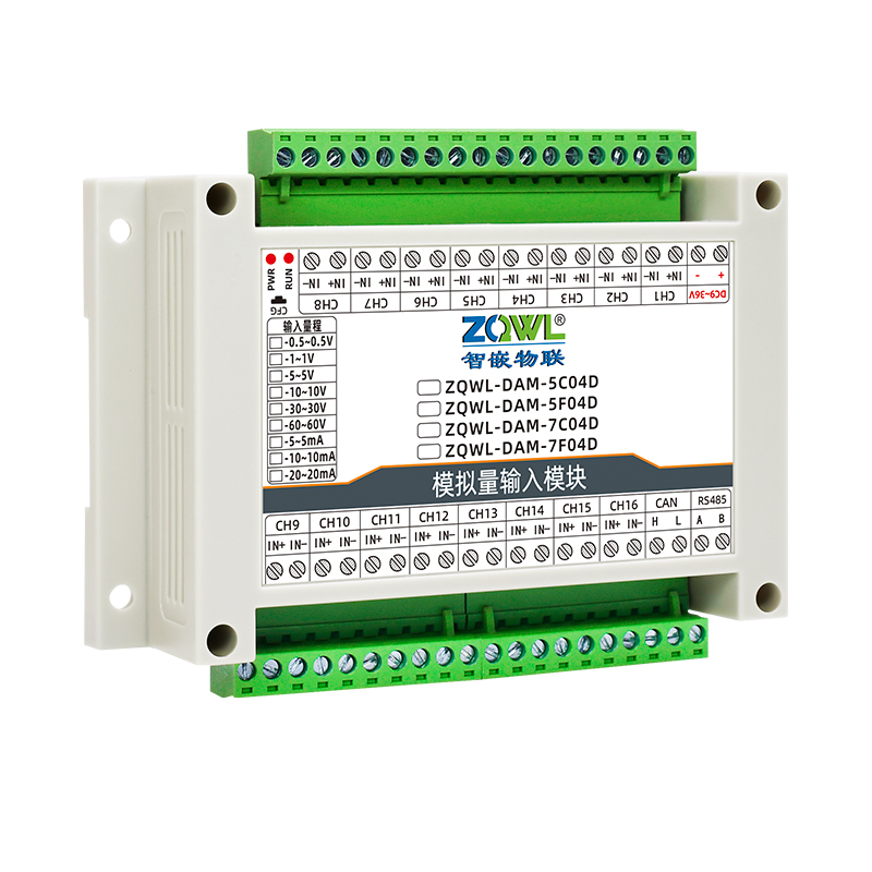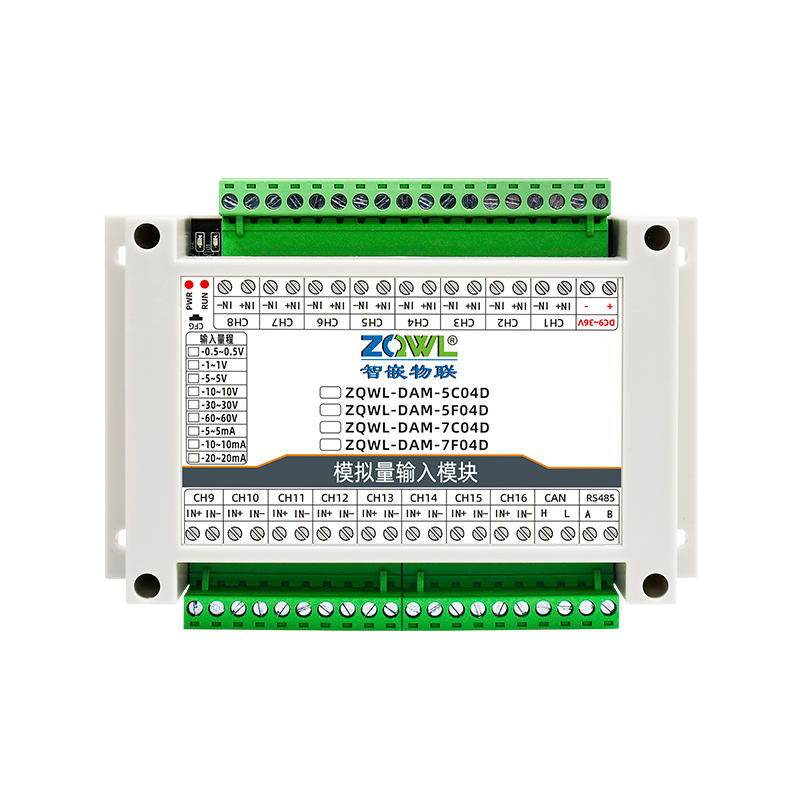 ZQWL-DAM-xx04D 模拟量输入系列是智嵌物联推出的高精度模拟量采集模块,采集量程可选:±0.5V;±1V;±5V;±10V;±30V;±60V;±5mA;±10mA;±20mA,内置1 个或2 个24 bit 的 ADC,采集精度 0.01%(万分之一)。