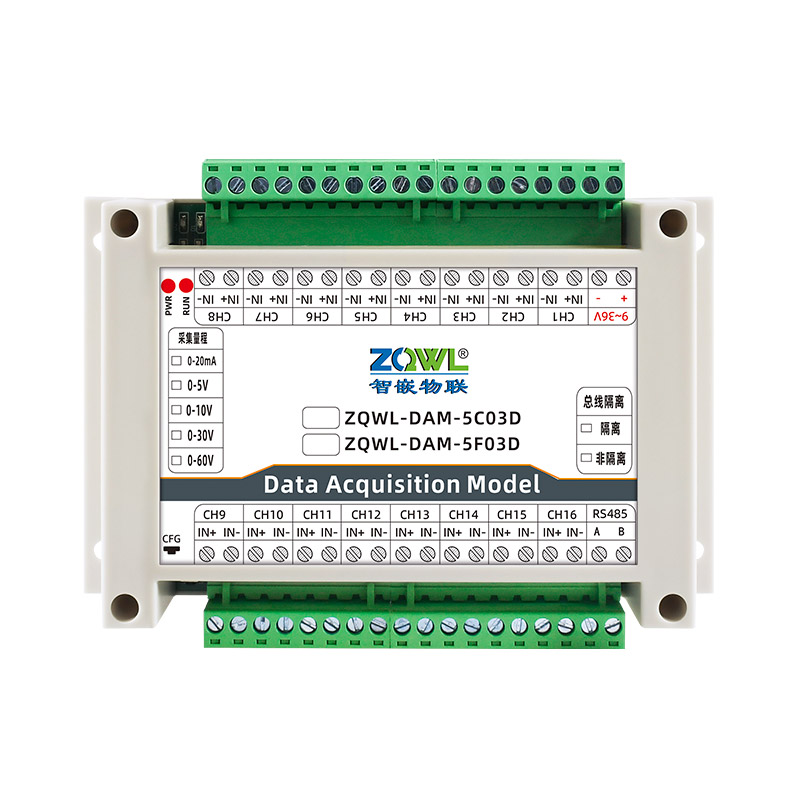 ZQWL-DAM模拟量采集系列是智嵌物联推出的高精度模拟量采集模块,量程可选:0~5V;0~10V;0~30V;0~60V;0~20mA,采集精度0.1%。采集板带有1路隔离的RS485或CAN通讯接口,可以通过该接口上传数据。该系列支持标准的有Modbus RTU协议,具有2种数据输出格式:16位无符号整型值输出和32位标准IEEE-754浮点数输出,使用灵活方便。