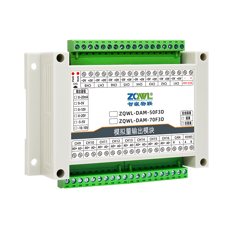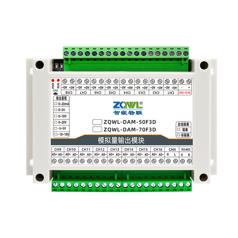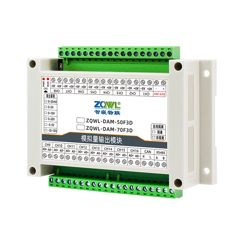 ZQWL-DAM-70F3D 16路 单极性模拟量输出系列是智嵌物联推出的高精度模拟量输出模块,输出量程可选: 0~5V;0~10V;0~20V;0~20mA,输出精度0.1%。模块带有1路隔离的RS485或CAN通讯接口,可以通过该接口上传数据。该系列支持标准的有Modbus RTU协议,具有2种数据输出格式:16位无符号整型值输出和32位标准IEEE-754浮点数输出,使用灵活方便。