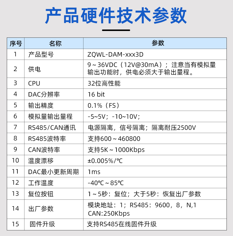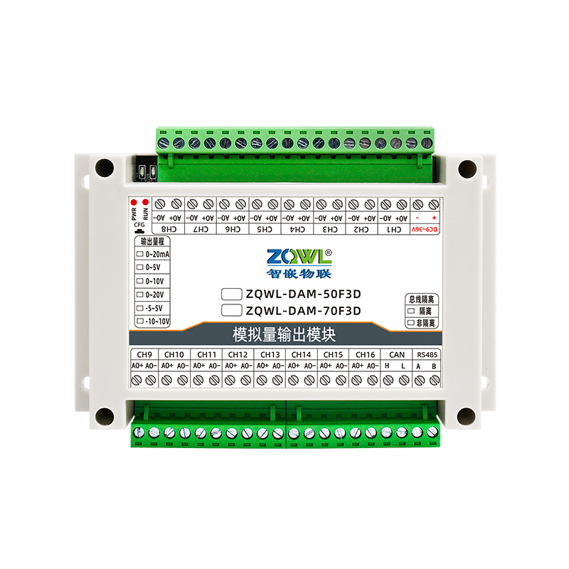 ZQWL-DAM-70F3D串口+CAN 双极性模拟量输出系列是智嵌物联推出的高精度模拟量输出模块,输出量程可选:-5~5V;-10~10V,输出精度 0.1%。模块带有 1 路隔离的 RS485 或 CAN 通讯接口,可以通过该接口上传数据。该系列支持标准的有 Modbus RTU 协议,具有 2 种数据输出格式:16 位无符号整型值输出和 32 位标准 IEEE-754 浮点数输出,使用灵活方便。
