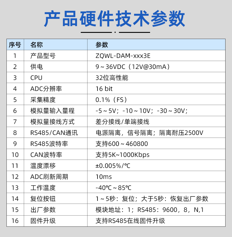 ZQWL-DAM 串口版+CAN版 双极性模拟量输入系列是智嵌物联推出的高精度模拟量输入模块,输入量程可选:-5~5V;-10~10V;-30~30V,采集精度 0.1%。模块带有 1 路隔离的 RS485 或 CAN 通讯接口,可以通过该接口上传数据。该系列支持标准的有 Modbus RTU 协议,具有 2 种数据输出格式:16 位无符号整型值输出和 32 位标准 IEEE-754 浮点数输出,使用灵活方便。
