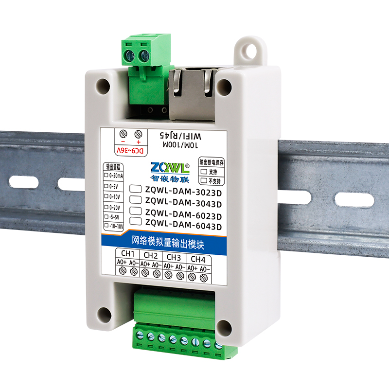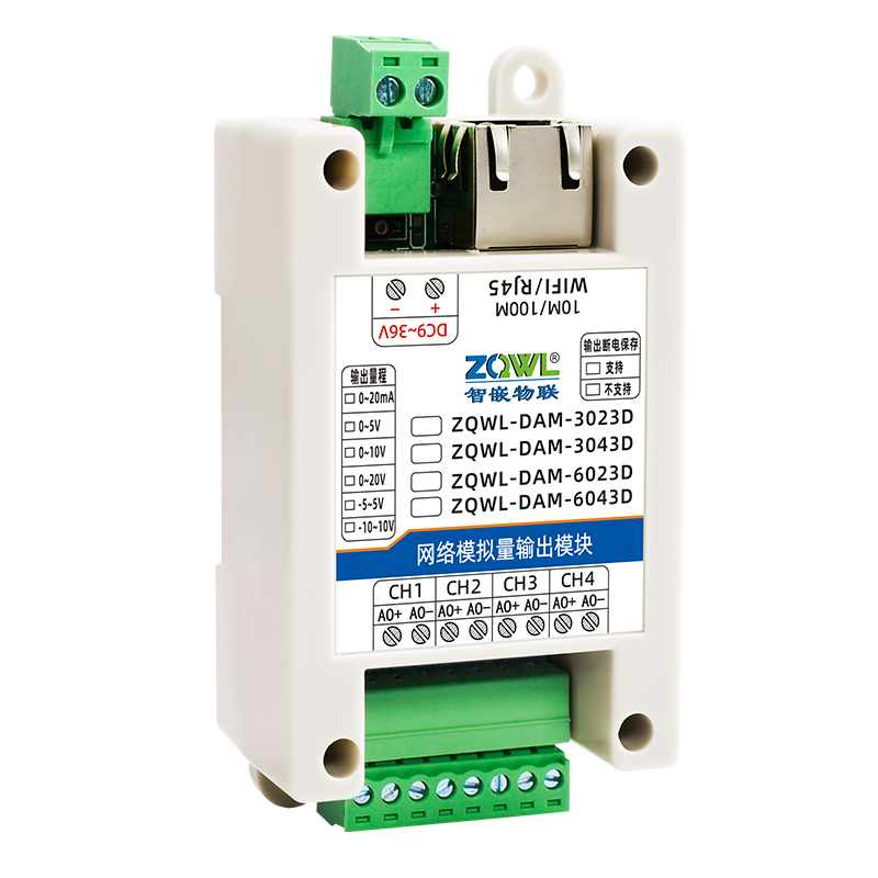 ZQWL-DAM-6023D 单极性模拟量输出系列是智嵌物联推出的高精度模拟量输出模块,输出量程可选:-5~5V;-10~10V,输出精度 0.1%。模块带有 1 路隔离的 RS485 或 CAN 通讯接口,可以通过该接口上传数据。该系列支持标准的有 Modbus RTU 协议,具有 2 种数据输出格式:16 位无符号整型值输出和 32 位标准 IEEE-754 浮点数输出,使用灵活方便。