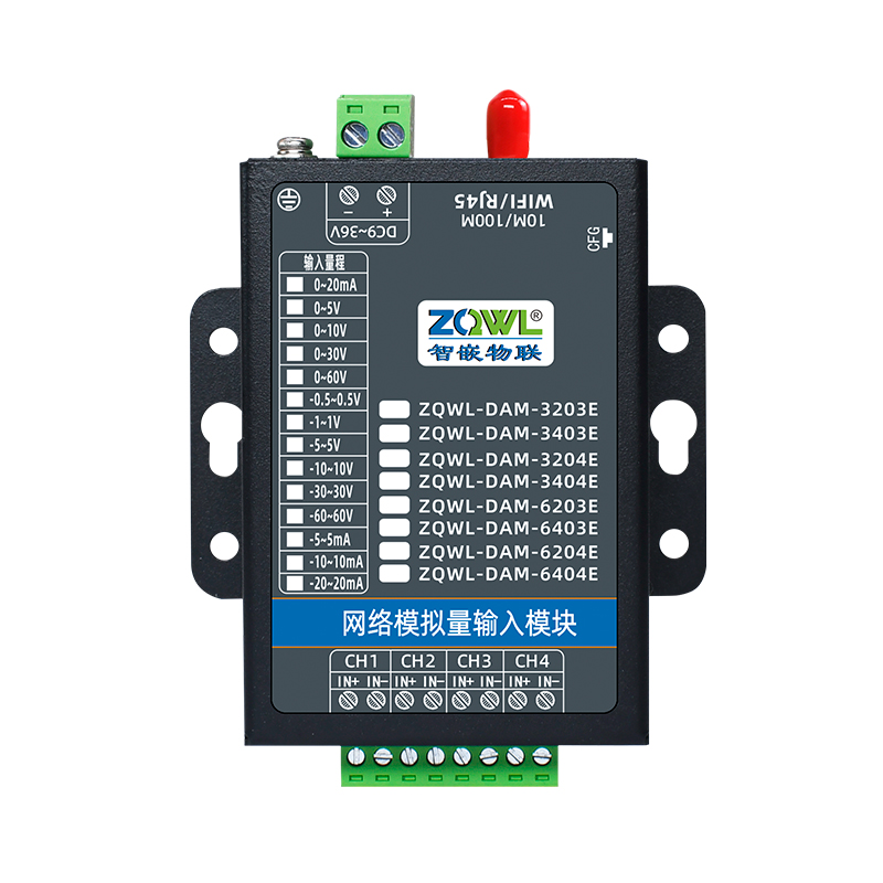 ZQWL-DAM 单极性模拟量输入系列是智嵌物联推出的高精度模拟量输入模块,输入量程可选:0~5V;0~10V;0~30V;0~60V;0~20mA,采集精度0.1%。模块带有 1 路网口或WIFI,可以通过该接口上传数据。设备内部集成了 TCP/IP 协议栈,支持标准的 Modbus TCP/RTU、MQTT和 JSON 等协议;支持 TCP SERVER、TCP CLIENT、UDP SERVER、UDP CLIENT 等工作模式,提供 2 种数据输出格式:16 位无符号整型值输出和 32 位标准IEEE-754 浮点数输出,使用灵活方便。