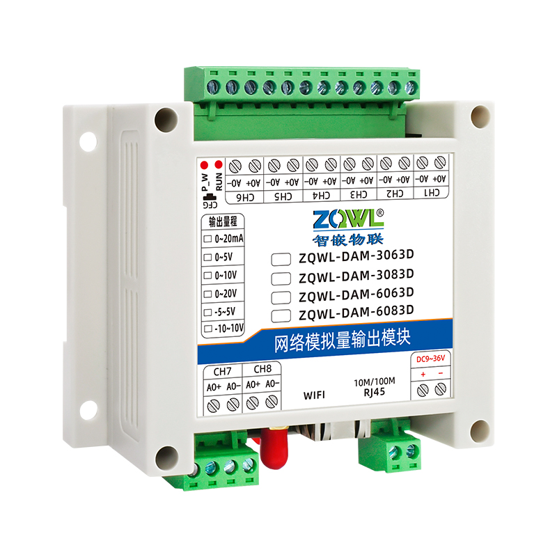 ZQWL-DAM-6063D 6路单极性模拟量输出系列是智嵌物联推出的高精度模拟量输出模块,输出量程可选: 0~5V;0~10V;0~20V;0~20mA,输出精度 0.1%。模块带有 1 路网口或WIFI,可以通过该接口上传数据。设备内部集成了 TCP/IP 协议栈,支持标准的 Modbus TCP/RTU、MQTT和 JSON 等协议;支持 TCP SERVER、TCP CLIENT、UDP SERVER、UDP CLIENT 等工作模式,提供 2 种数据输出格式:16 位无符号整型值输出和 32 位标准IEEE-754 浮点数输出,使用灵活方便。