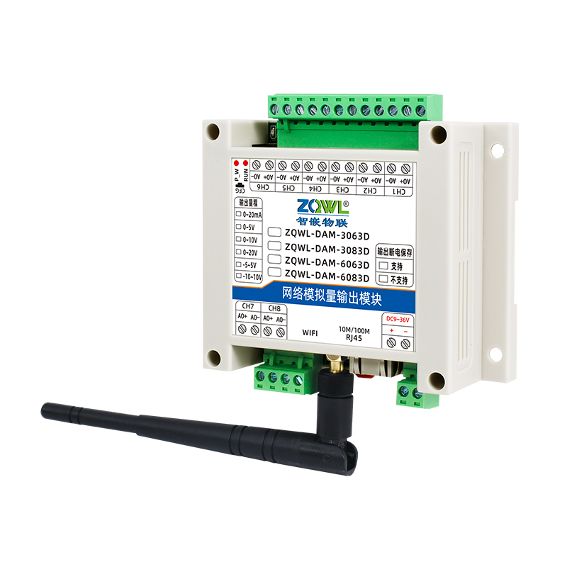 ZQWL-DAM-6063D 单极性模拟量输出系列是智嵌物联推出的高精度模拟量输出模块,输出量程可选:-5~5V;-10~10V,输出精度 0.1%。模块带有 1 路隔离的 RS485 或 CAN 通讯接口,可以通过该接口上传数据。该系列支持标准的有 Modbus RTU 协议,具有 2 种数据输出格式:16 位无符号整型值输出和 32 位标准 IEEE-754 浮点数输出,使用灵活方便。