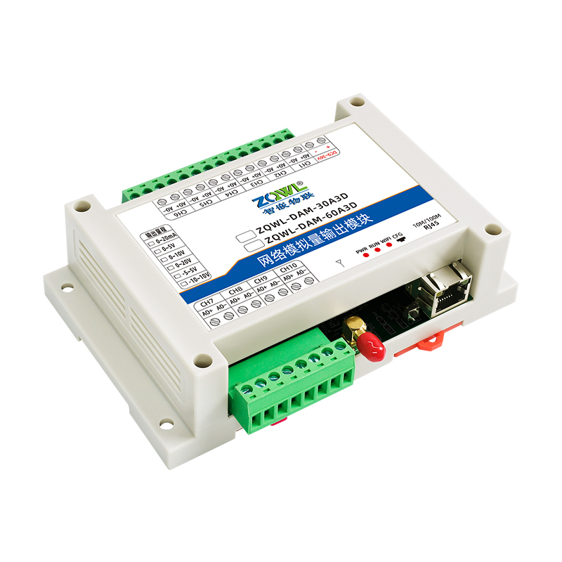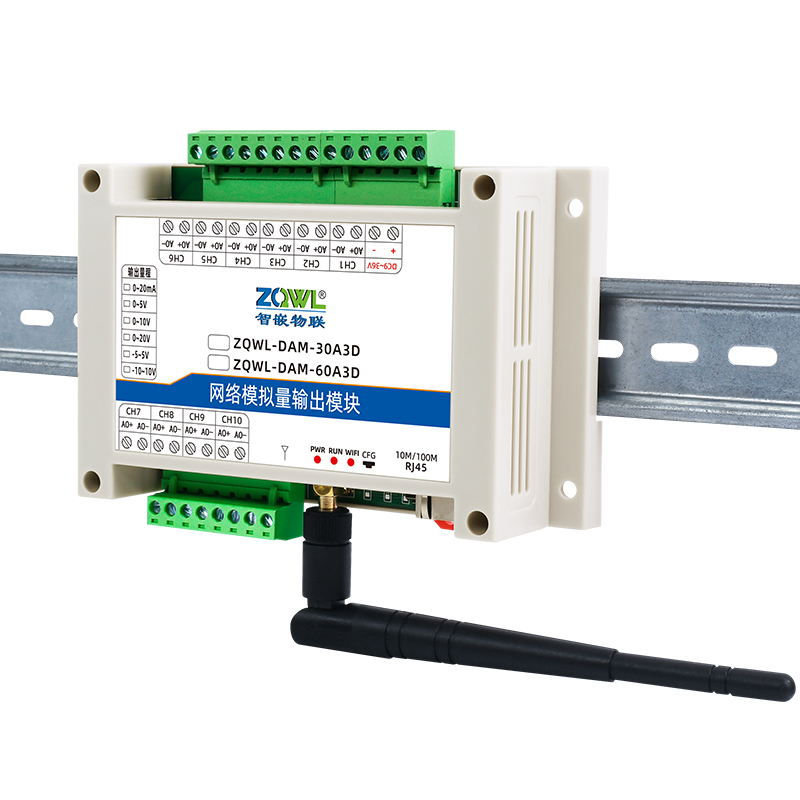 ZQWL-DAM-60A3D 10路单极性模拟量输出系列是智嵌物联推出的高精度模拟量输出模块,输出量程可选: 0~5V;0~10V;0~20V;0~20mA,输出精度 0.1%。模块带有 1 路网口或WIFI,可以通过该接口上传数据。设备内部集成了 TCP/IP 协议栈,支持标准的 Modbus TCP/RTU、MQTT和 JSON 等协议;支持 TCP SERVER、TCP CLIENT、UDP SERVER、UDP CLIENT 等工作模式,提供 2 种数据输出格式:16 位无符号整型值输出和 32 位标准IEEE-754 浮点数输出,使用灵活方便。