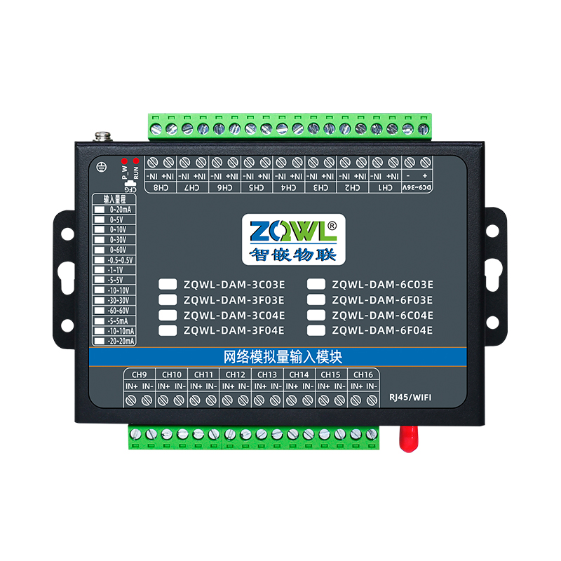 ZQWL-DAM 单极性模拟量输入系列是智嵌物联推出的高精度模拟量输入模块,输入量程可选:0~5V;0~10V;0~30V;0~60V;0~20mA,采集精度0.1%。模块带有 1 路网口或WIFI,可以通过该接口上传数据。设备内部集成了 TCP/IP 协议栈,支持标准的 Modbus TCP/RTU、MQTT和 JSON 等协议;支持 TCP SERVER、TCP CLIENT、UDP SERVER、UDP CLIENT 等工作模式,提供 2 种数据输出格式:16 位无符号整型值输出和 32 位标准IEEE-754 浮点数输出,使用灵活方便。