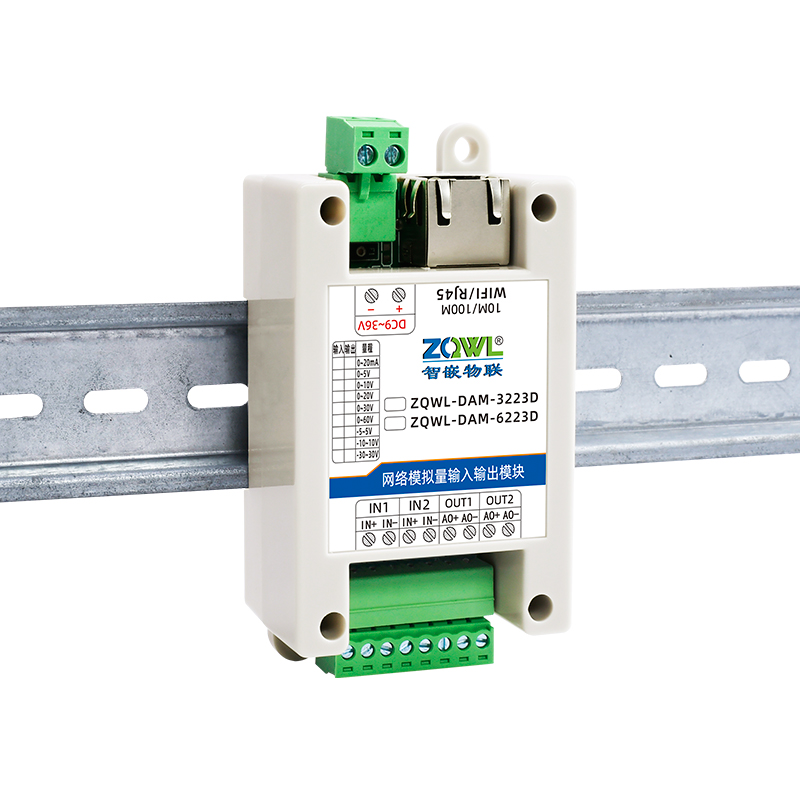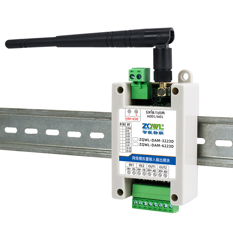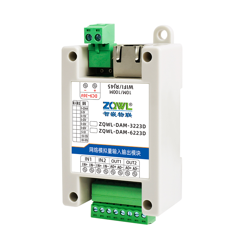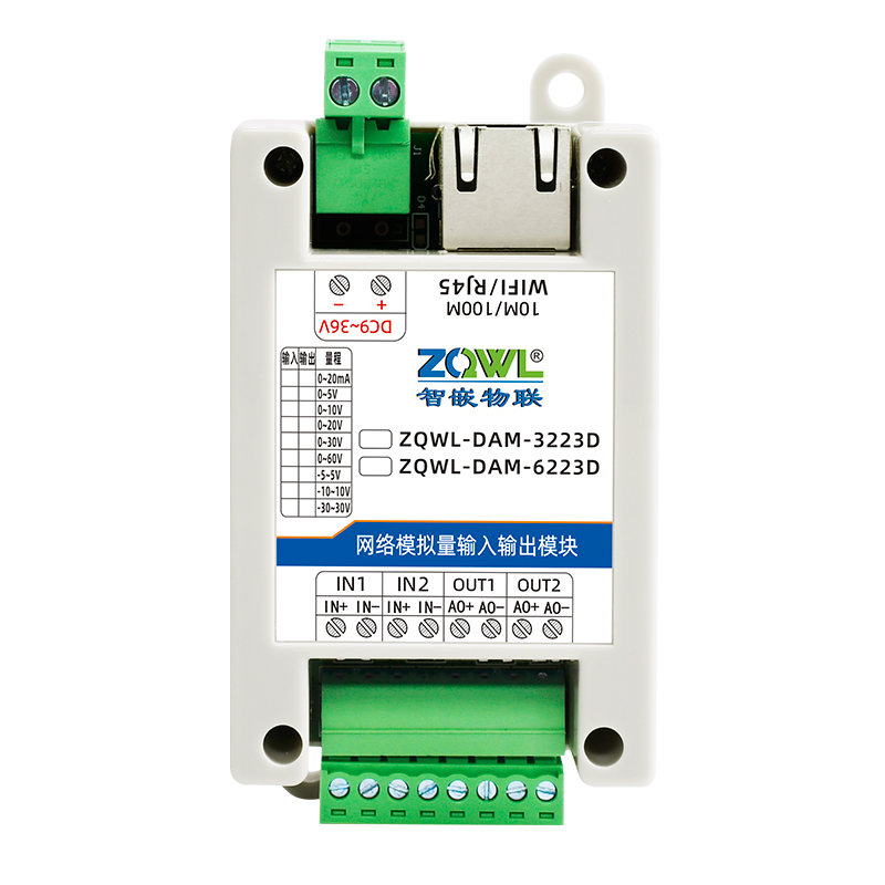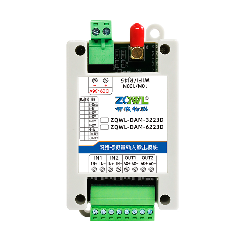 ZQWL-DAM-3223D 双极性模拟量输入输出系列是智嵌物联推出的高精度模拟量输入和输出模块,输入量程可选:-5~5V;-10~10V;-30~30V,采集精度 0.1%。输出量程可选:-5~5V;-10~10V,输出精度 0.1%。模块带有 1 路网口或 WIFI,可以通过该接口上传数据。设备内部集成了 TCP/IP 协议栈,支持标准的 Modbus TCP/RTU、MQTT 和JSON 等协议;支持TCP SERVER、TCP CLIENT、UDP SERVER、UDP CLIENT 等工作模式,提供2 种数据输出格式:16 位无符号整型值输出和 32 位标准 IEEE-754 浮点数输出,使用灵活方便。