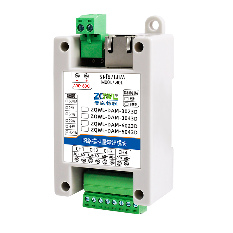 ZQWL-DAM-3023D 双极性模拟量输出系列是智嵌物联推出的高精度模拟量输出模块,输出量程可选:-5~5V;-10~10V,输出精度 0.1%。模块带有 1 路隔离的 RS485 或 CAN 通讯接口,可以通过该接口上传数据。该系列支持标准的有 Modbus RTU 协议,具有 2 种数据输出格式:16 位无符号整型值输出和 32 位标准 IEEE-754 浮点数输出,使用灵活方便。