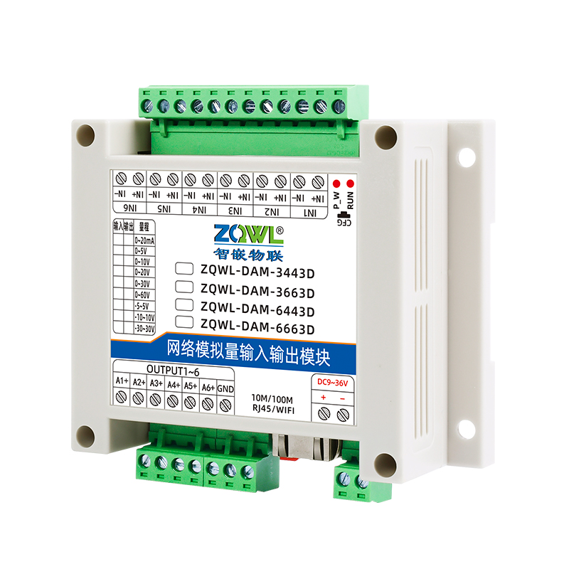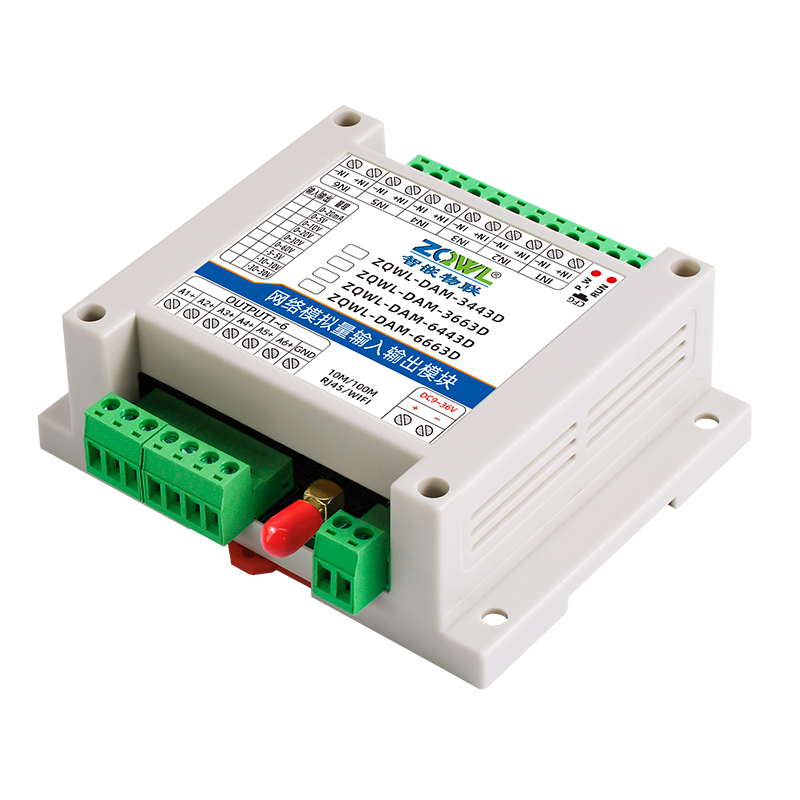 ZQWL-DAM-3443D 单极性模拟量输入输出系列是智嵌物联推出的高精度模拟量输入和输出模块,输入量程可选:0~5V;0~10V;0~30V;0~60V;0~20mA,采集精度0.1%。输出量程可选: 0~5V;0~10V;0~20V;0~20mA,输出精度 0.1%。模块带有 1 路网口或WIFI,可以通过该接口上传数据。设备内部集成了 TCP/IP 协议栈,支持标准的 Modbus TCP/RTU、MQTT和 JSON 等协议;支持 TCP SERVER、TCP CLIENT、UDP SERVER、UDP CLIENT 等工作模式,提供 2 种数据输出格式:16 位无符号整型值输出和 32 位标准IEEE-754 浮点数输出,使用灵活方便。