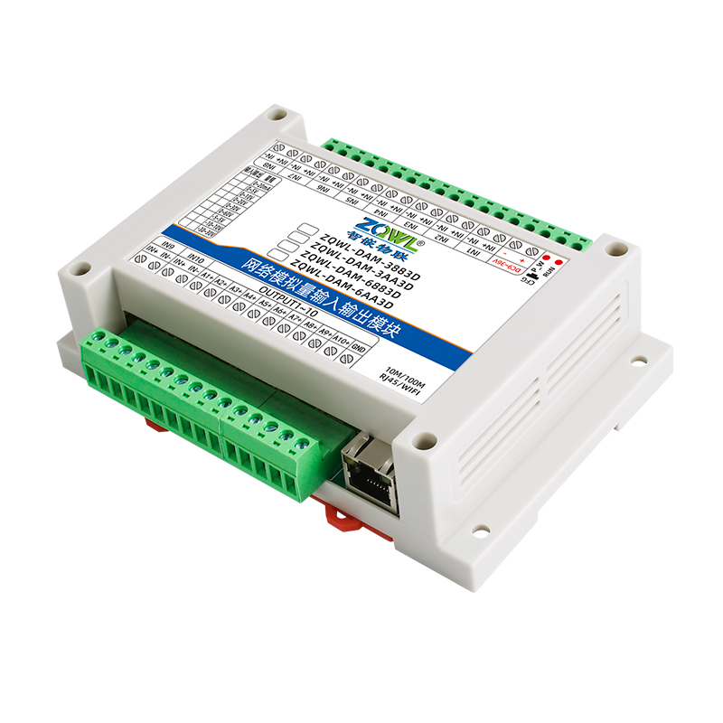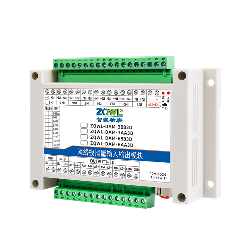 ZQWL-DAM-3883D 单极性模拟量输入输出系列是智嵌物联推出的高精度模拟量输入和输出模块,输入量程可选:0~5V;0~10V;0~30V;0~60V;0~20mA,采集精度0.1%。输出量程可选: 0~5V;0~10V;0~20V;0~20mA,输出精度 0.1%。模块带有 1 路网口或WIFI,可以通过该接口上传数据。设备内部集成了 TCP/IP 协议栈,支持标准的 Modbus TCP/RTU、MQTT和 JSON 等协议;支持 TCP SERVER、TCP CLIENT、UDP SERVER、UDP CLIENT 等工作模式,提供 2 种数据输出格式:16 位无符号整型值输出和 32 位标准IEEE-754 浮点数输出,使用灵活方便。