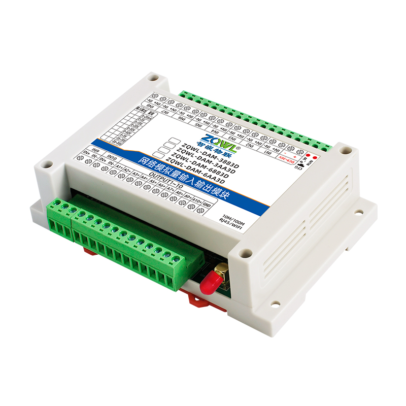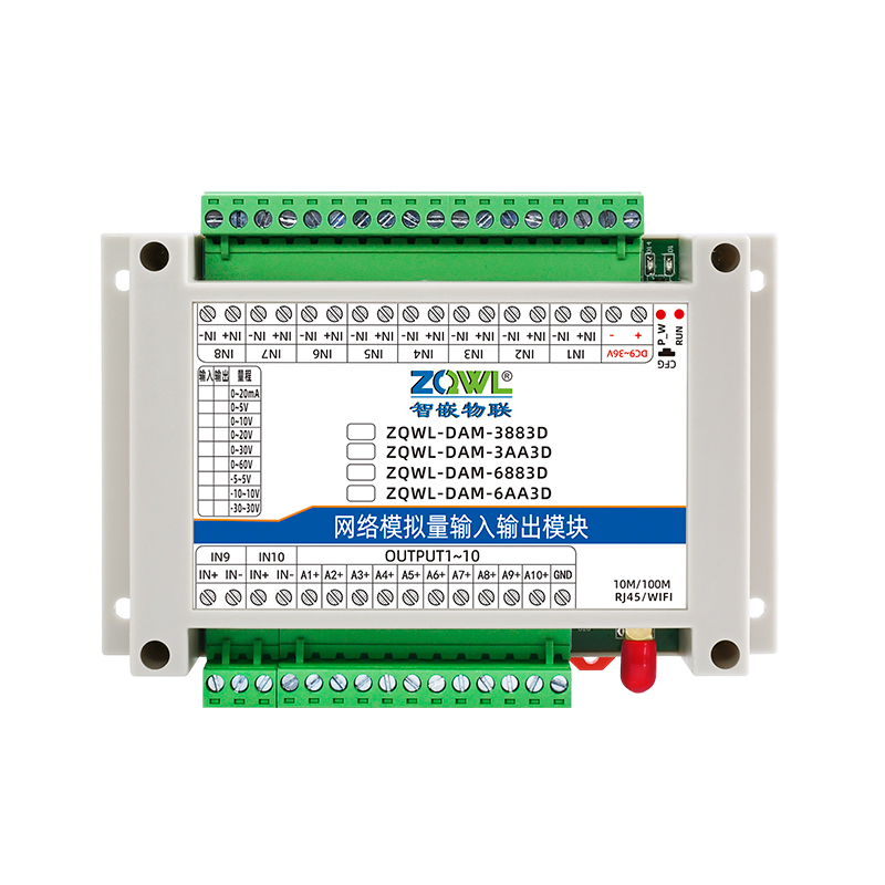 ZQWL-DAM-3883D 双极性模拟量输入输出系列是智嵌物联推出的高精度模拟量输入和输出模块,输入量程可选:-5~5V;-10~10V;-30~30V,采集精度 0.1%。输出量程可选:-5~5V;-10~10V,输出精度 0.1%。模块带有 1 路网口或 WIFI,可以通过该接口上传数据。设备内部集成了 TCP/IP 协议栈,支持标准的 Modbus TCP/RTU、MQTT 和JSON 等协议;支持TCP SERVER、TCP CLIENT、UDP SERVER、UDP CLIENT 等工作模式,提供2 种数据输出格式:16 位无符号整型值输出和 32 位标准 IEEE-754 浮点数输出,使用灵活方便。