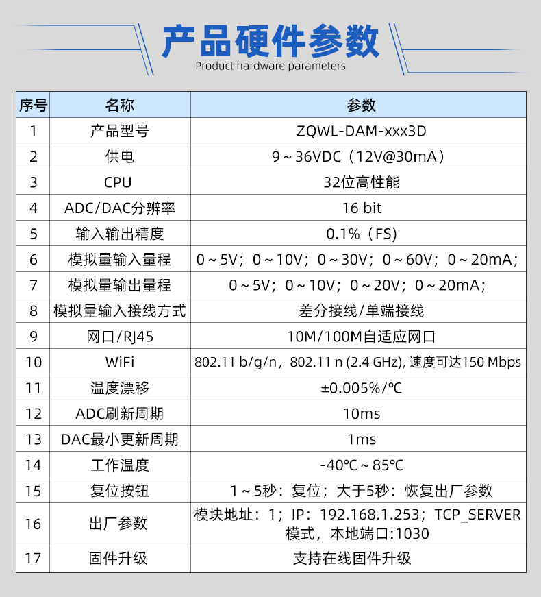 ZQWL-DAM-10路 单极性模拟量输入输出系列是智嵌物联推出的高精度模拟量输入和输出模块,输入量程可选:0~5V;0~10V;0~30V;0~60V;0~20mA,采集精度 0.1%。输出量程可选: 0~5V;0~10V;0~20V;0~20mA,输出精度 0.1%。模块带有 1 路网口或 WIFI,可以通过该接口上传数据。设备内部集成了 TCP/IP 协议栈,支持标准的 Modbus TCP/RTU、MQTT和 JSON 等协议;支持 TCP SERVER、TCP CLIENT、UDP SERVER、UDP CLIENT 等工作模式,提供 2 种数据输出格式:16 位无符号整型值输出和 32 位标准 IEEE-754 浮点数输出,使用灵活方便。
