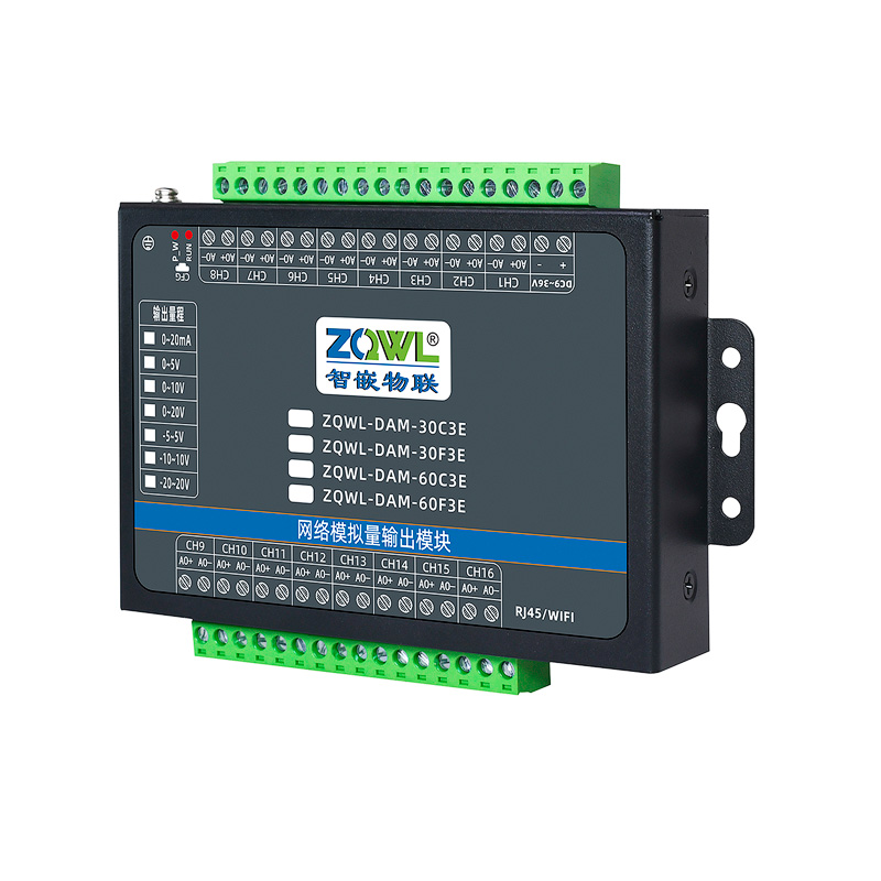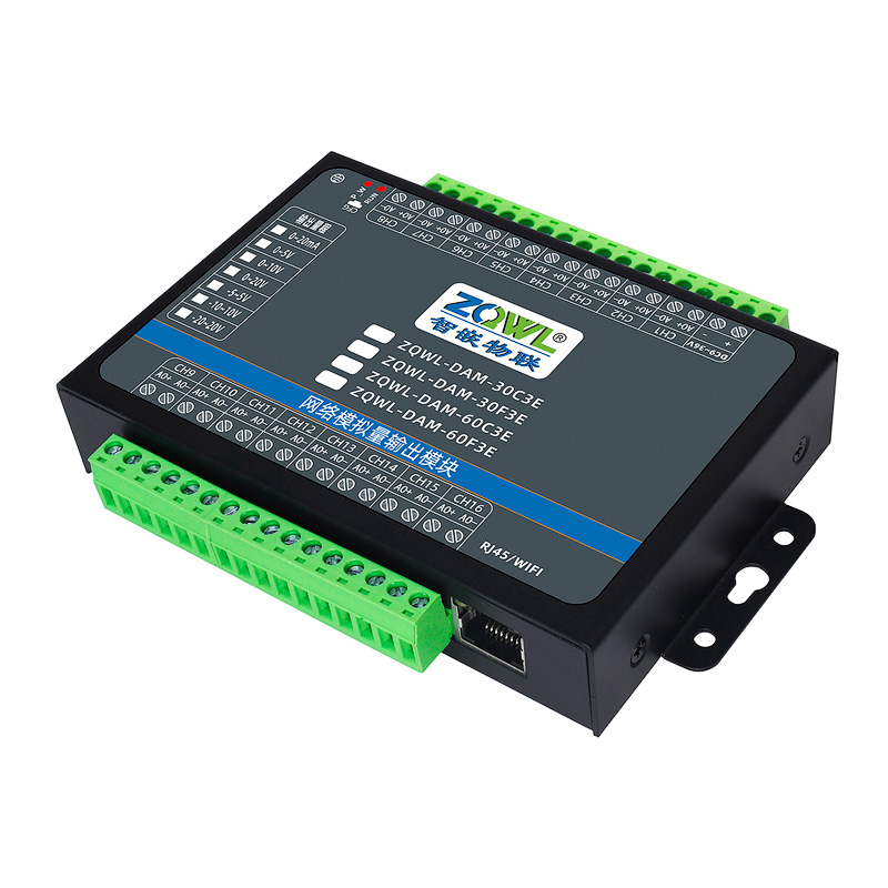 ZQWL-DAM-60C3E 双极性模拟量输出是智嵌物联推出的高精度模拟量输出模块,输出量程可选:-5~5V;-10~10V,输出精度 0.1%。模块带有 1 路网口或 WIFI,可以通过该接口上传数据。设备内部集成了 TCP/IP 协议栈,支持标准的 Modbus TCP/RTU、MQTT 和JSON 等协议;支持TCP SERVER、TCP CLIENT、UDP SERVER、UDP CLIENT 等工作模式,提供2 种数据输出格式:16 位无符号整型值输出和 32 位标准 IEEE-754 浮点数输出,使用灵活方便。