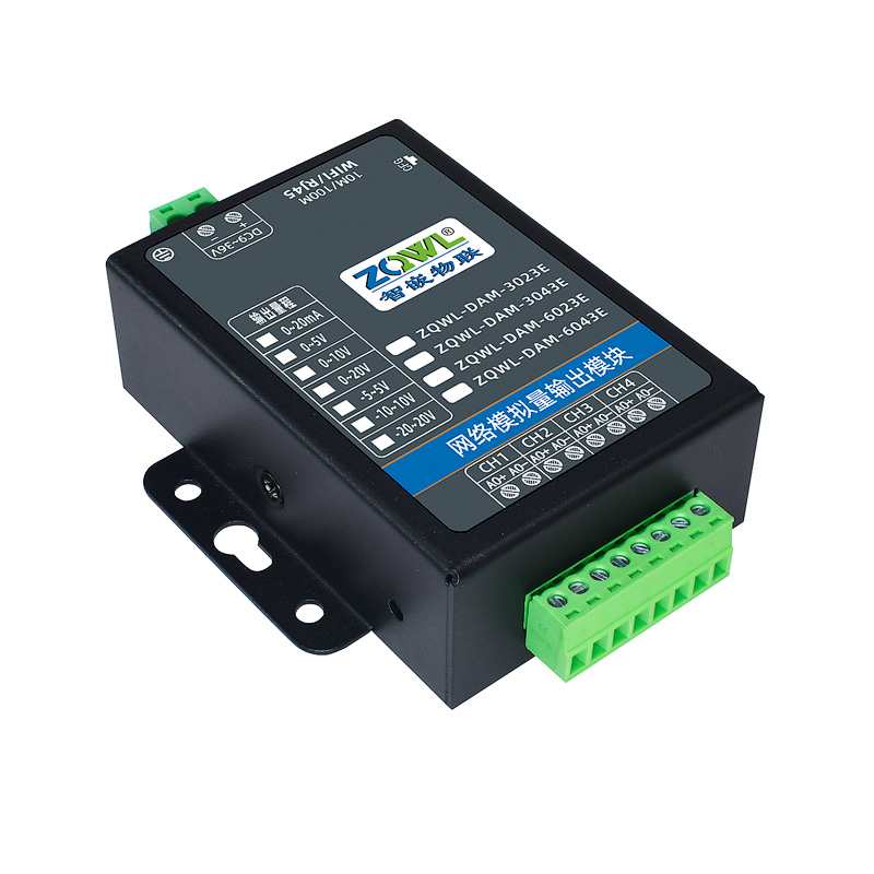ZQWL-DAM-3023E 单极性模拟量输出是智嵌物联推出的高精度模拟量输出模块,输出量程可选: 0~5V;0~10V;0~20V;0~20mA,输出精度 0.1%。模块带有 1 路网口或 WIFI,可以通过该接口上传数据。设备内部集成了 TCP/IP 协议栈,支持标准的 Modbus TCP/RTU、MQTT和 JSON 等协议;支持 TCP SERVER、TCP CLIENT、UDP SERVER、UDP CLIENT 等工作模式,提供 2 种数据输出格式:16 位无符号整型值输出和 32 位标准 IEEE-754 浮点数输出,使用灵活方便。