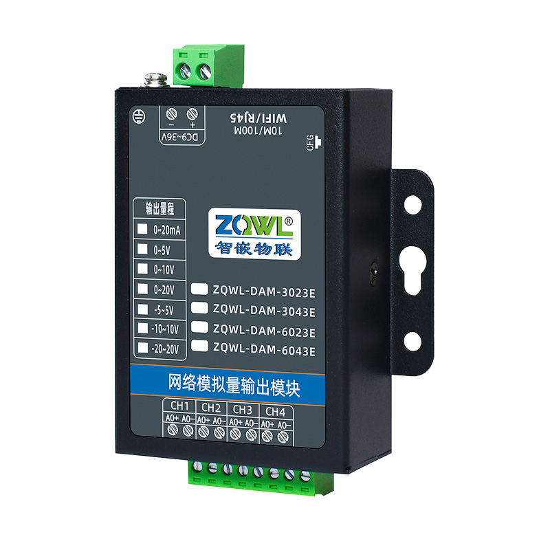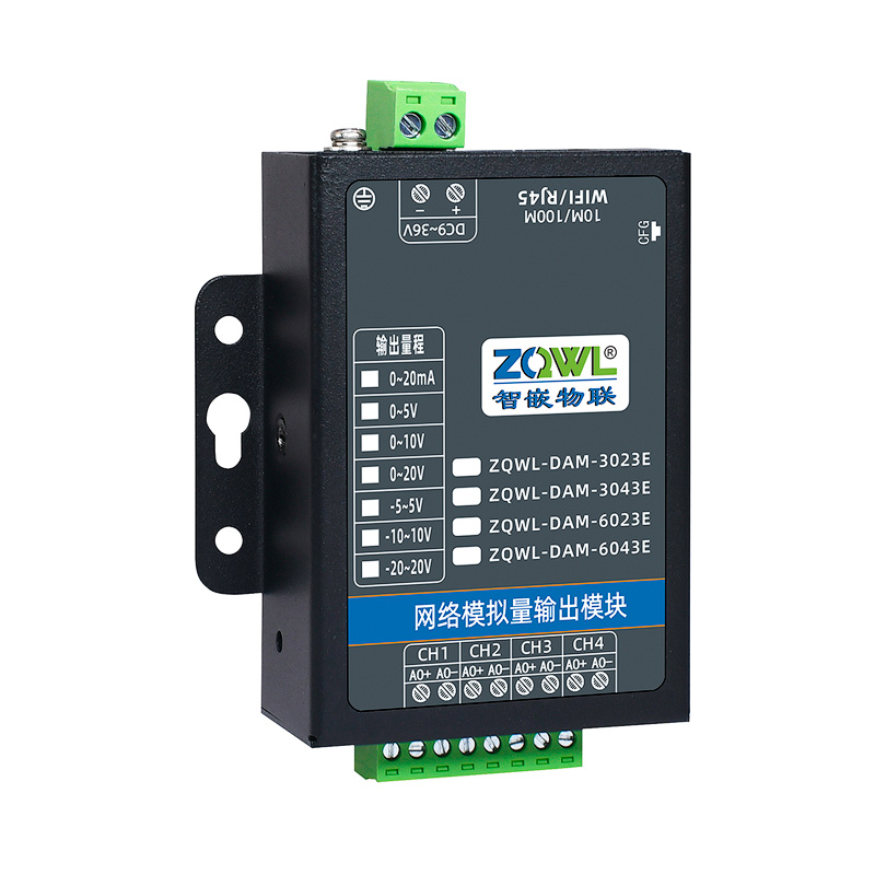 ZQWL-DAM-3043E 单极性模拟量输出是智嵌物联推出的高精度模拟量输出模块,输出量程可选: 0~5V;0~10V;0~20V;0~20mA,输出精度 0.1%。模块带有 1 路网口或 WIFI,可以通过该接口上传数据。设备内部集成了 TCP/IP 协议栈,支持标准的 Modbus TCP/RTU、MQTT和 JSON 等协议;支持 TCP SERVER、TCP CLIENT、UDP SERVER、UDP CLIENT 等工作模式,提供 2 种数据输出格式:16 位无符号整型值输出和 32 位标准 IEEE-754 浮点数输出,使用灵活方便。