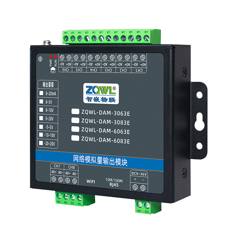 ZQWL-DAM-3083E 双极性模拟量输出是智嵌物联推出的高精度模拟量输出模块,输出量程可选:-5~5V;-10~10V,输出精度 0.1%。模块带有 1 路网口或 WIFI,可以通过该接口上传数据。设备内部集成了 TCP/IP 协议栈,支持标准的 Modbus TCP/RTU、MQTT 和JSON 等协议;支持TCP SERVER、TCP CLIENT、UDP SERVER、UDP CLIENT 等工作模式,提供2 种数据输出格式:16 位无符号整型值输出和 32 位标准 IEEE-754 浮点数输出,使用灵活方便。