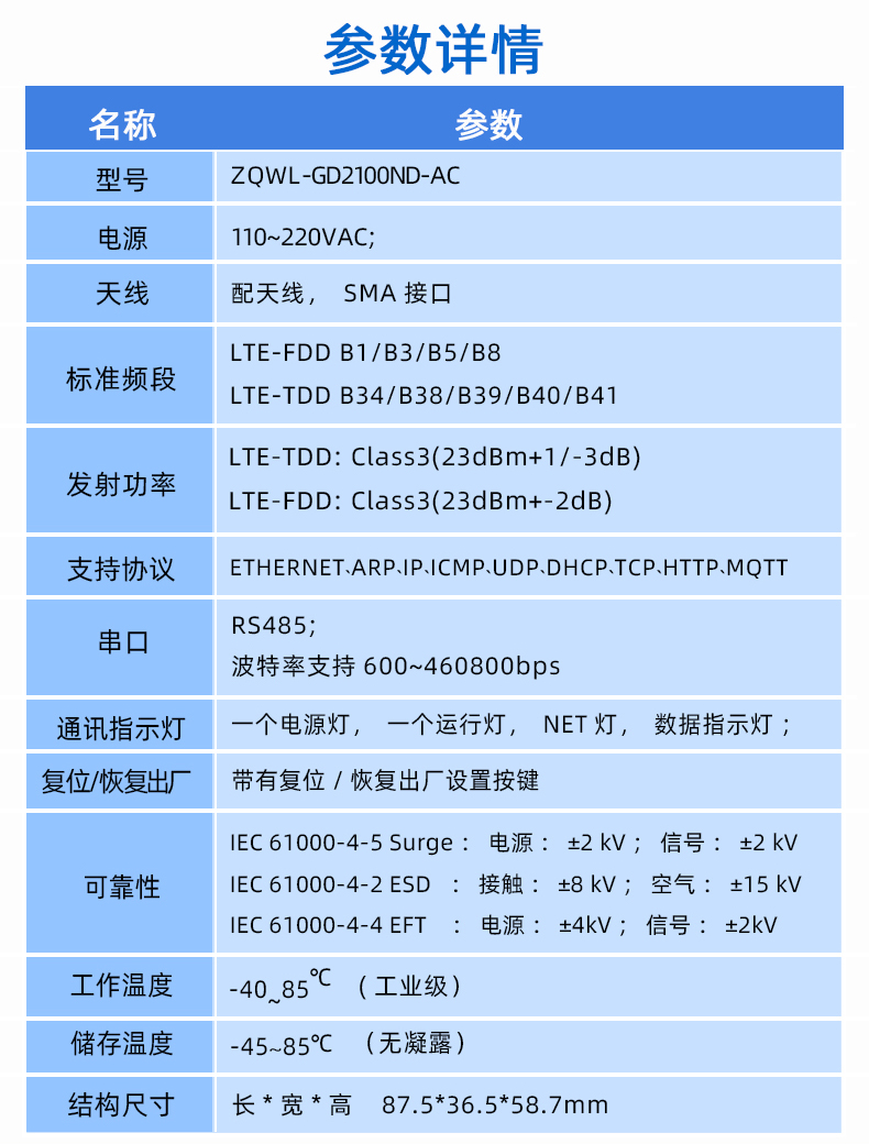 智嵌物联自主研发的 ZQWL- GD2100ND-AC,是一款基于电信、联通、移动全网通网络的 4G DTU 设备,可以轻松实现串口设备与 4G 网络间的数据透传,让用户的串口设备轻松实现与 Internet 的无线连接。本设备网络覆盖范围广,有 4G 信号的地方就能使用,组网安装方便,广泛应用于机房监控、环境监控、智能交通、道闸控制、智能快递柜等行业。