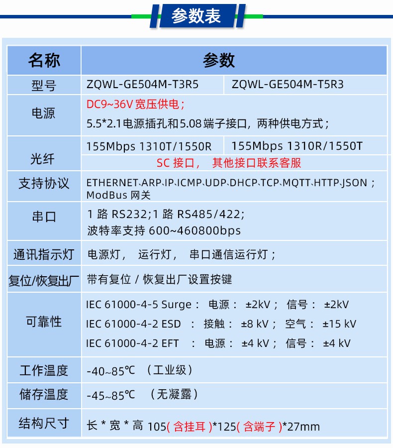 智嵌物联ZQWL自主研发的高性价比单串口服务器ZQWL-GE504M,具有1路网口、1路光口、一路RS232/RS485/RS422,可以实现串口数据与网口数据互转、串口数据与光口数据互转、网口数据与光口数据互转。内部集成了 TCP/P 协议栈,可实现串口到以太网口数据的双向透明传输、ModBus 协议转换等功能。设备通过简单的配置,即可轻松实现串口设备的联网、上云等功能。广泛应用于机房监控、智慧农业、环境监控、智能交通、道闸控制、智能快递柜等行业。支持多种通讯协议:MQTT、HTTP、TCP、UDP、JSON、Web Socket、ModbusTCP/RTU 主从等。