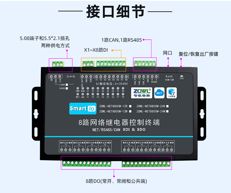 ZQWL-NET-8800M具有8路DI,既可以检测开关状态,也可以对脉冲计数,外部信号均通过光耦与内部的cpu隔离,抗干扰能力强大。