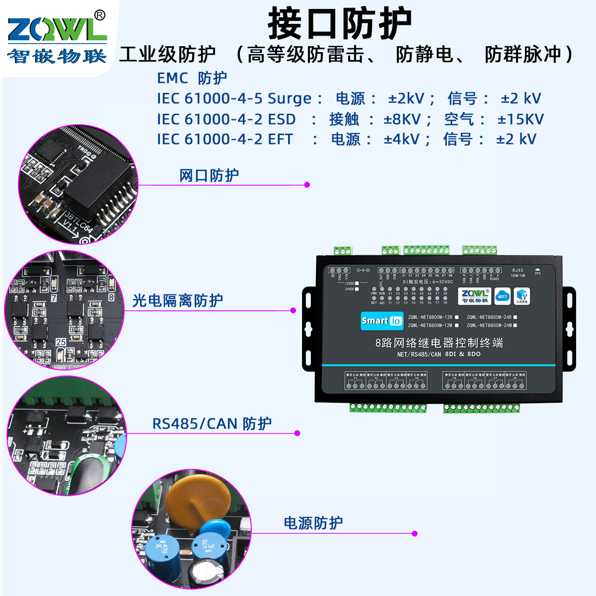 ZQWL-NET-8800M是智嵌物联根据客户需求研发的一款可编程的8路网络IO控制终端。该产品内置RS485串口服务器功能,具有网络与RS485数据透传以及Modbus TCP转RTU功能。