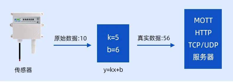 如Modbus轮询的应答数据与真实值之间存在线性关系,可使用设备的kx+b的线性缩放功能,直接将真实值上传到服务器。