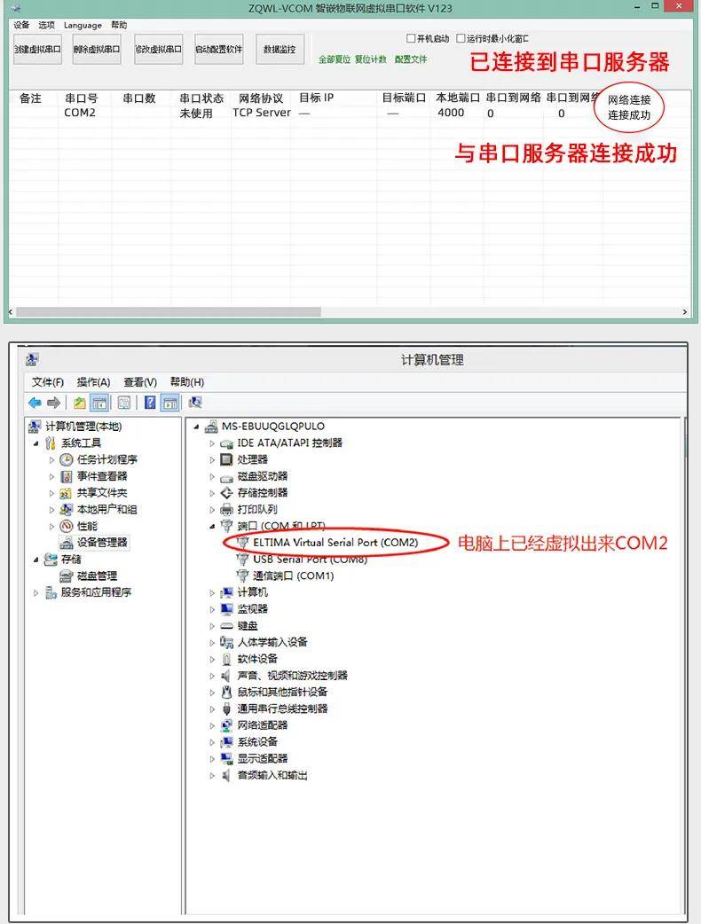 虚拟串口软件通过串口服务器的网口虚拟出若干个串口,解决PC机串口数量不足问题。原有PC机上的串口软件不需要任何改动即可与现场的串口设备通讯。