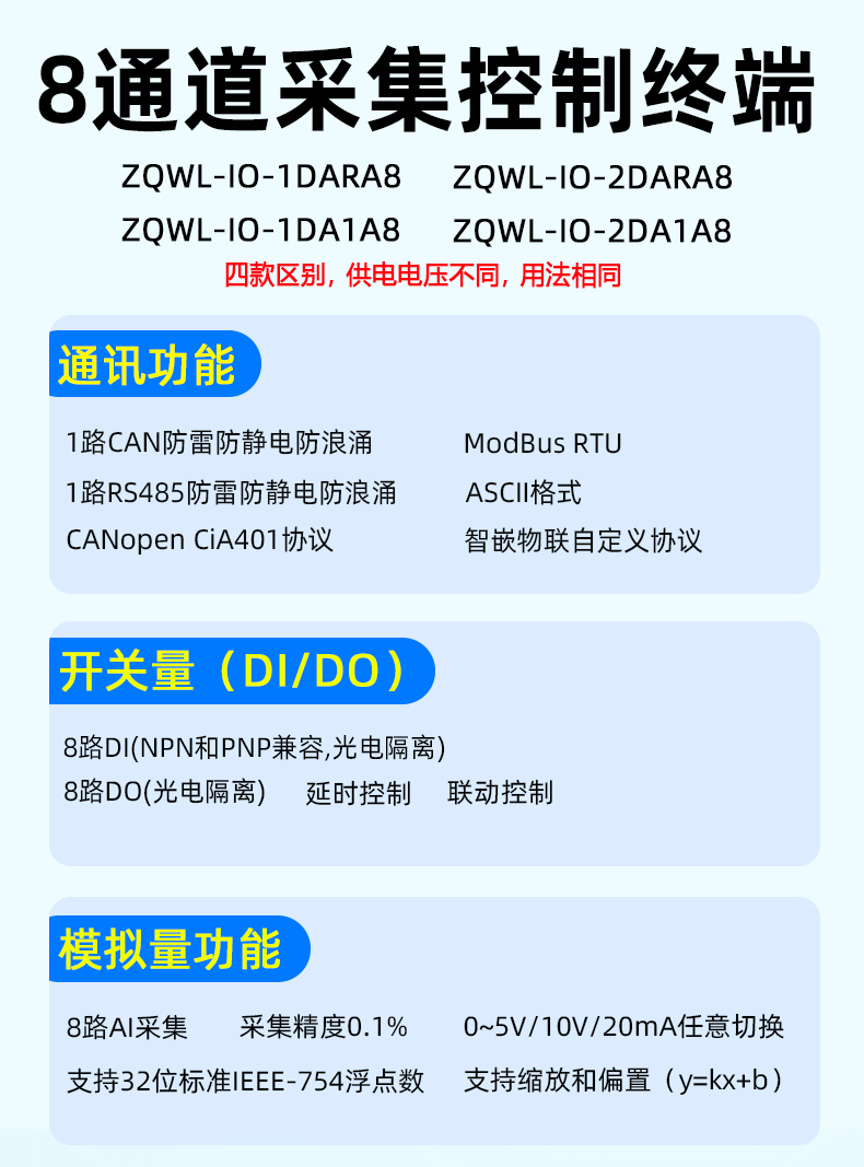 智嵌物联ZQWL十多年来致力于工业通讯/控制以及物联网通讯领域,精心打造了一批又一批的工业通讯和控制精品,ZQWL-IO-1DA1A8是智嵌物联又一力作。通讯具有CAN、RS485功能,支持Modbus RTU、ASCII、CANopen CiA401等协议,通讯接口具有防雷防静电能力。该产品有8路模拟量采集(0~5V/10V/20mA)。8路DI(光电隔离)和8路DO(光电隔离)。