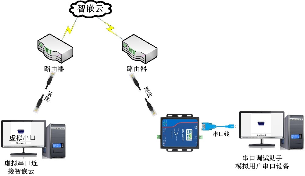 本文档旨在说明如何利用智嵌云实现数据的远程透传。虚拟串口连接智嵌云,并与串口服务器设备绑定,这样虚拟串口向智嵌云上发数据,智嵌云会将数据透传到已绑定的串口服务器上,串口服务器又将数据透传到相对应的串口上,从而实现数据的透传。