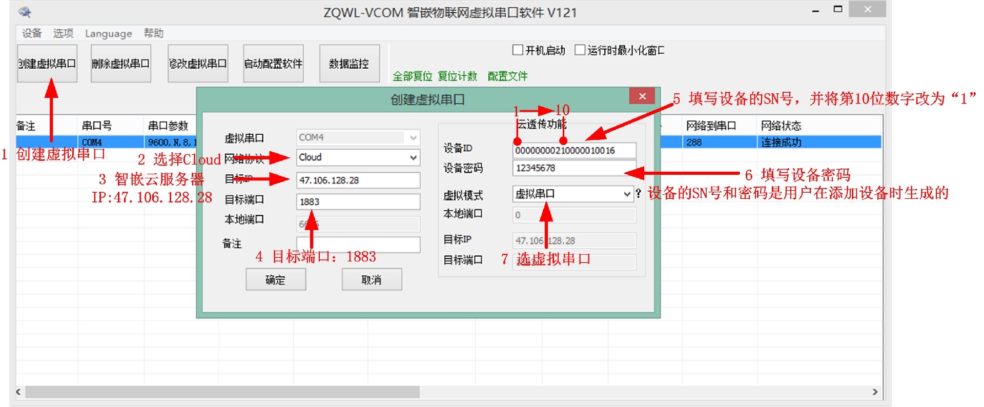 图11 虚拟串口接入智嵌云并保定设备步骤