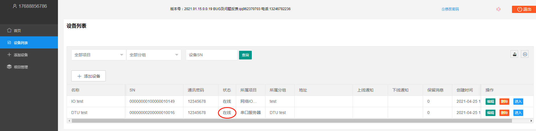 设备添加完成后,在设备列表菜单下找到刚添加的设备,复制设备SN及通讯密码,后面备用。