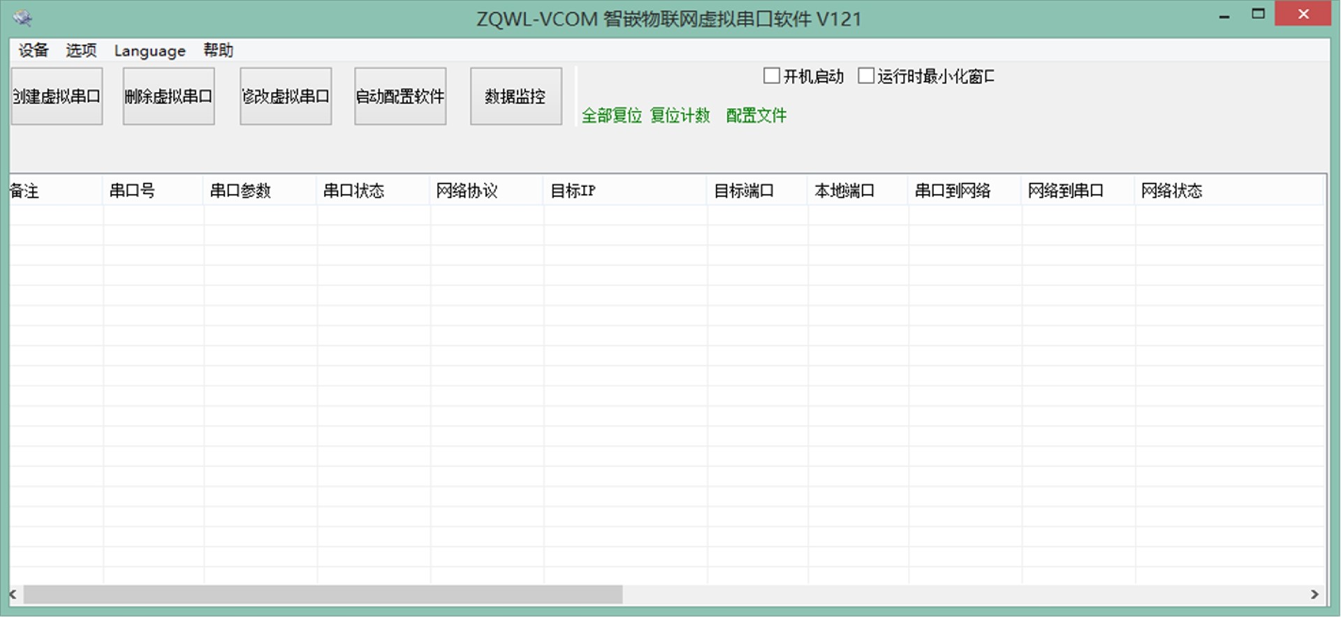 在智嵌物联官网下载虚拟串口软件“ZQWL-VCOM虚拟串口软件”,按照提示安装并打开,界面如图10所示。